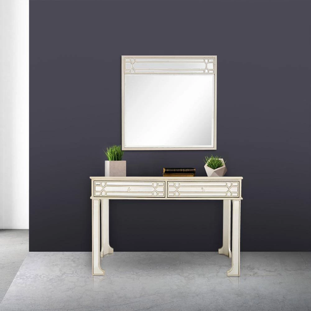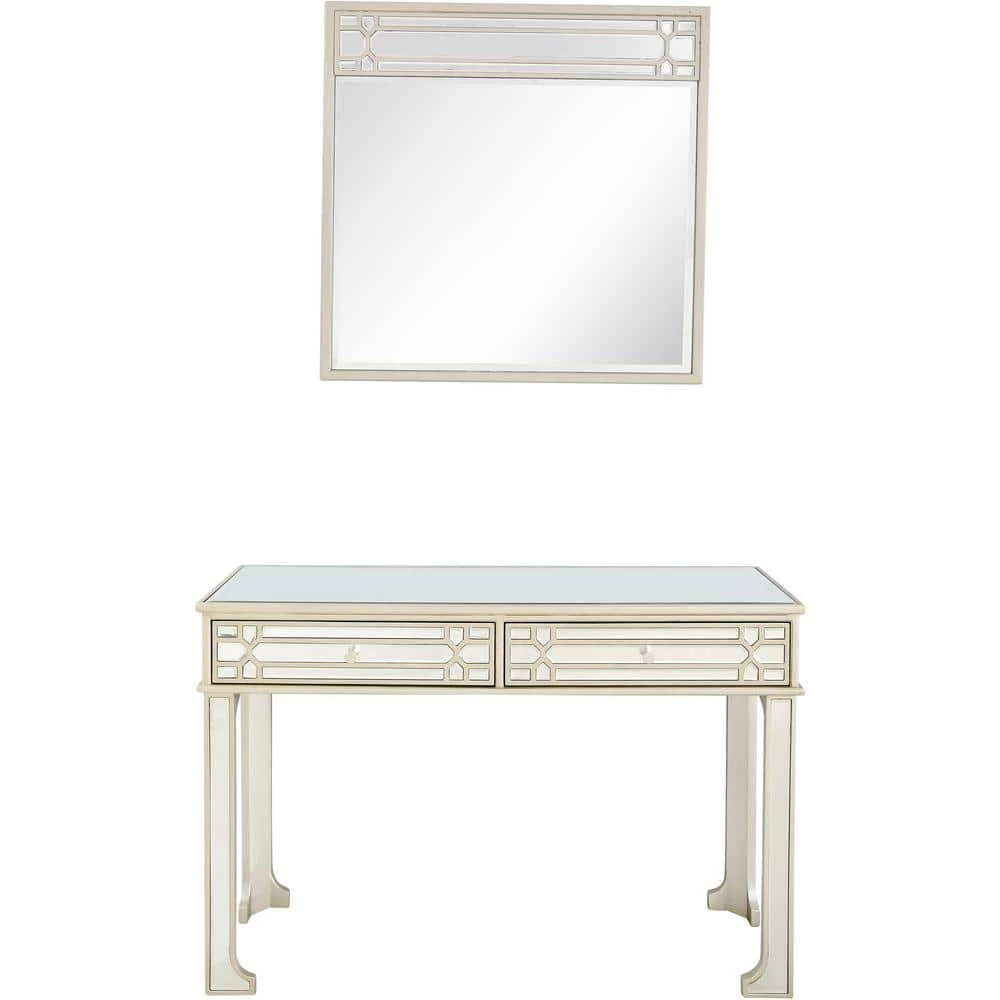 Add a regal feel anywhere in your home with the stylish Aubrey Mirror Console. With its beautifully crafted drawers from beveled mirror pieces, this console exudes elegance and charm. Its champagne color and uniquely designed legs add a new dimension to your living room or entryway. Add a luxurious touch to your living space with Aubrey Beveled Accent Mirror. It features an intricate design on the top border that adds a touch of elegance to your decor. Its square shape makes it ideal for smaller walls, but it looks equally good in any space with its antiqued champagne frame. This lovely mirror blends beautifully into any color palette. Beveled 36 in. x 36 in. mirror has a high quality silver backing. Ready to hang either vertically or horizontally with pre-attached hanging mounts.