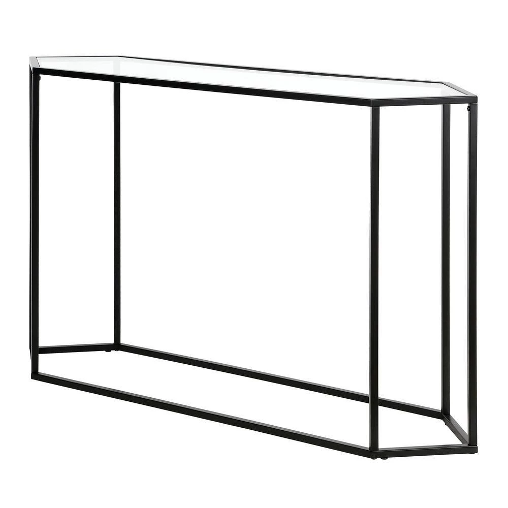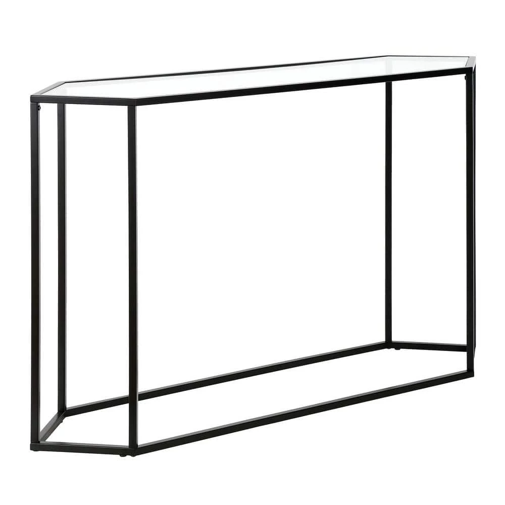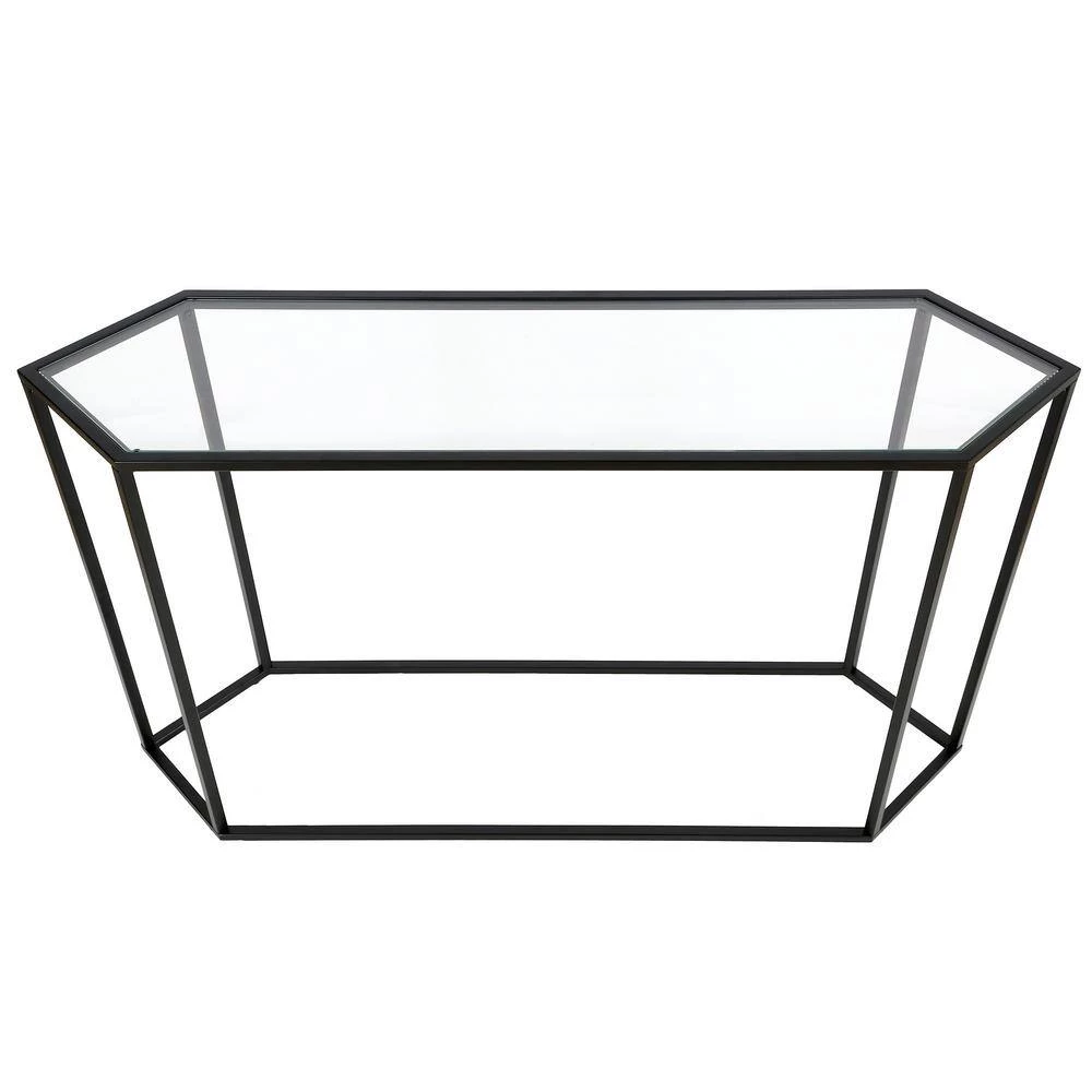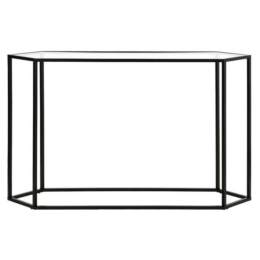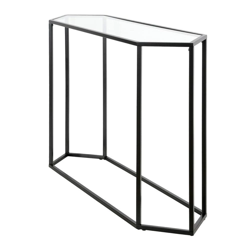 Minimalist modern design and a compact footprint makes this table that perfect extra bit of storage you need in any space. The hexagonal shape and strong linear frame add visual interest but allow your photos, plants, or collectibles to take center stage. Go glam in brass or contemporary in blackened bronze, against the clean backdrop of clear tempered glass.