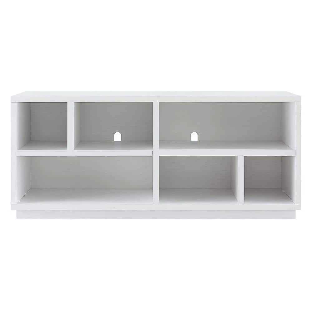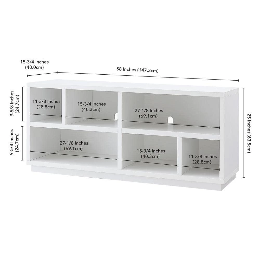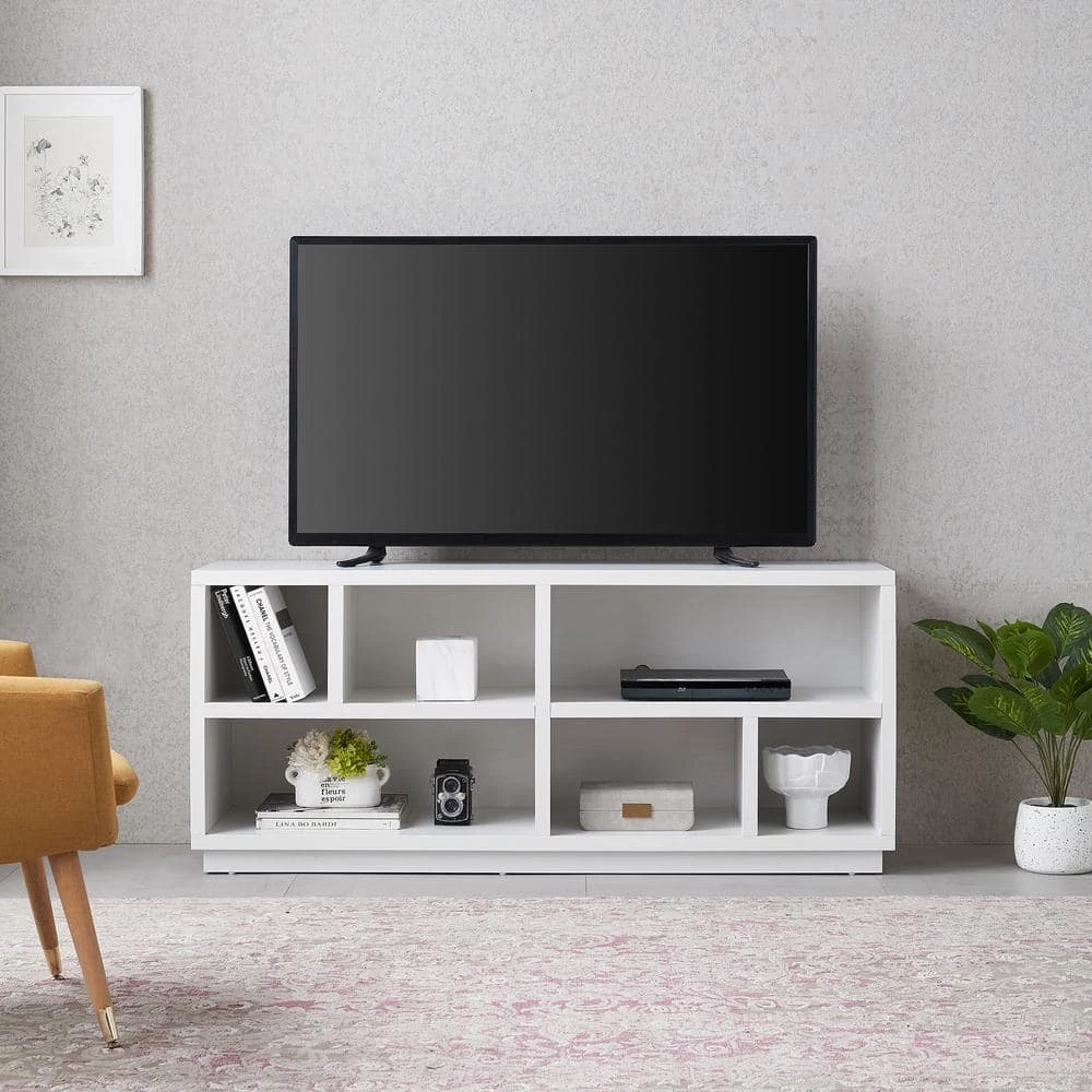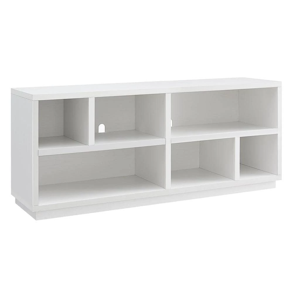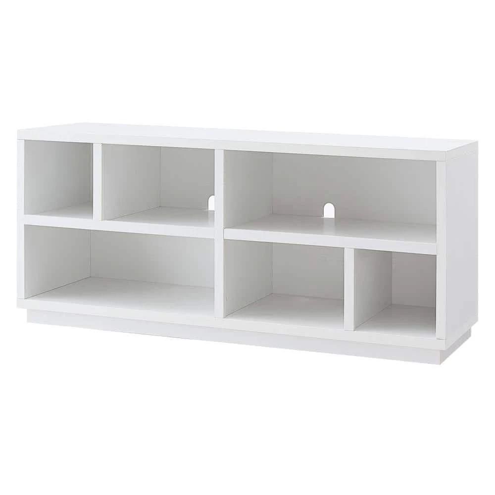 - Stand features 2-open lower shelves with 6 distinct compartments