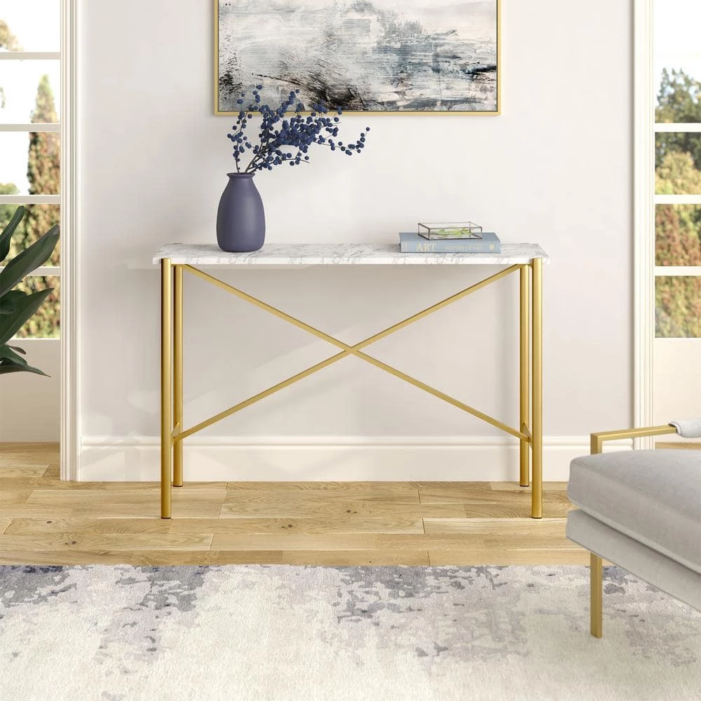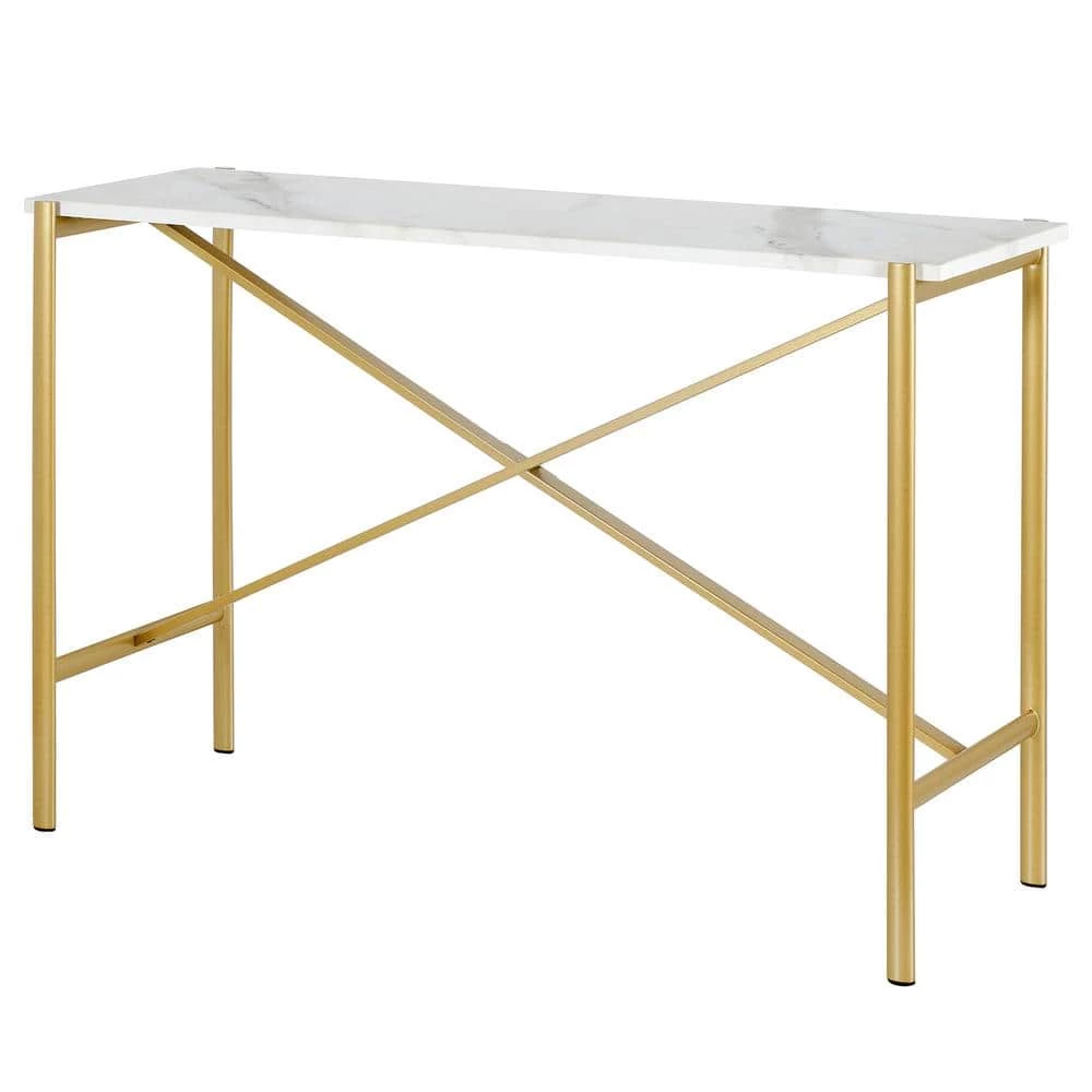 Geometric design takes this modern console table to the next level. A seamless blend of mixed materials gives this table an industrial style while the lustrous metallic finish keeps your space warm and inviting. Easy to assemble and easy to style, the faux marble top and on-trend frame shape make it the perfect addition to your living room or bedroom ensemble.