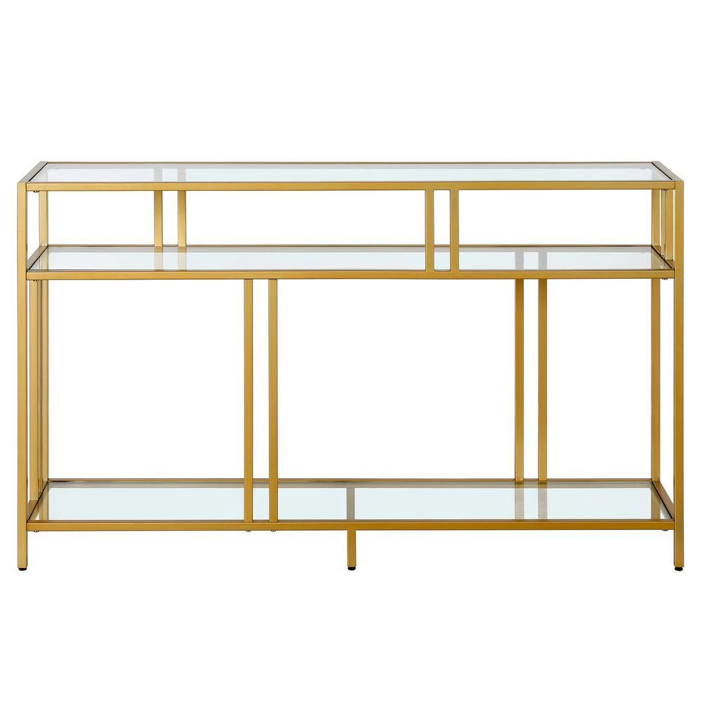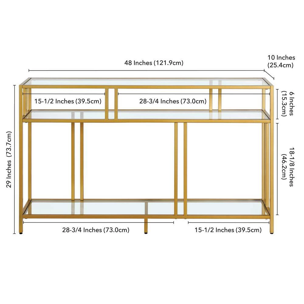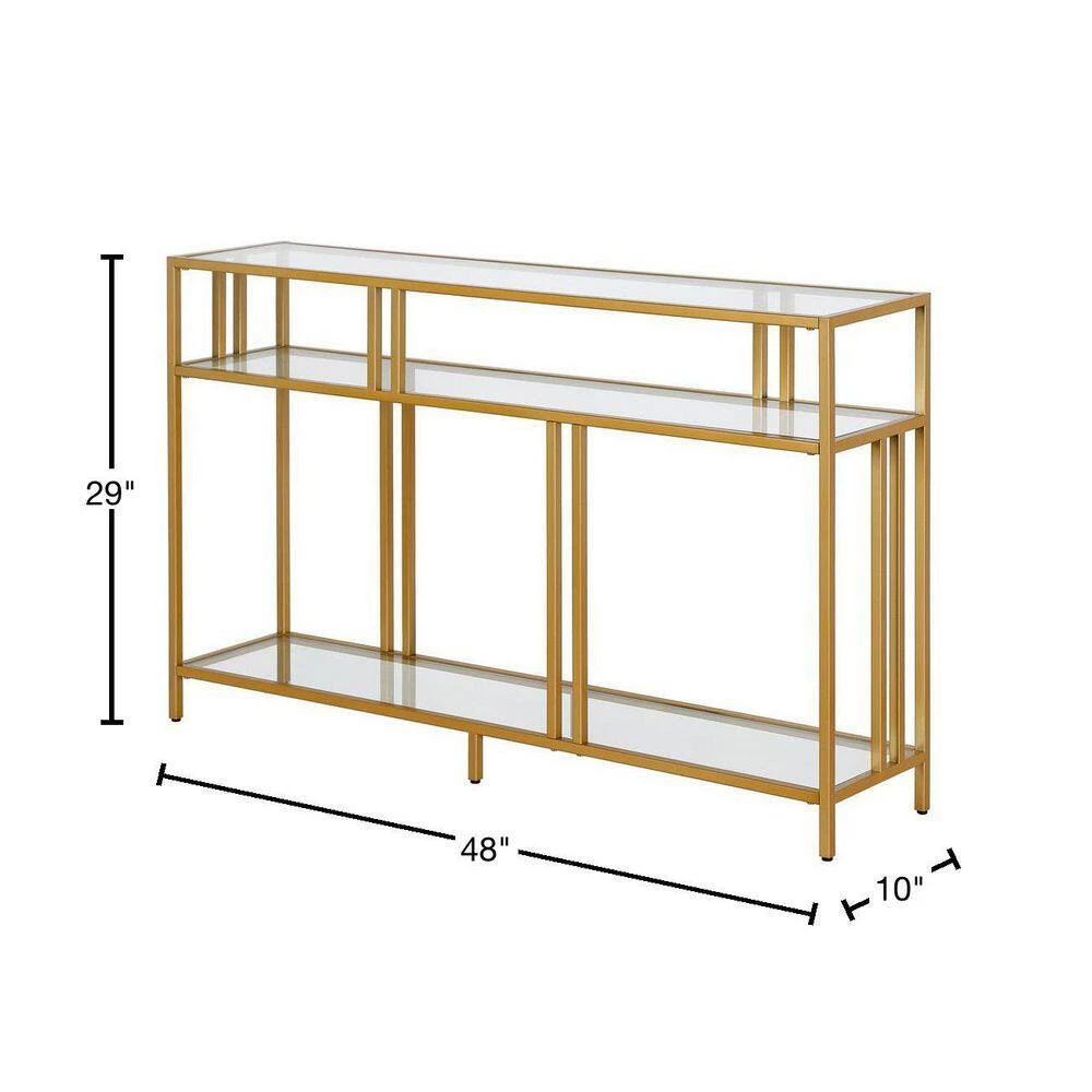 A strong linear profile sets this industrial-inspired console table apart. It’s double-barred accents offset the durable tempered glass shelving, creating an artful backdrop for framed photos, flowers, or your favorite collections of decorative items. The streamlined look and neutral metallic finish pairs seamlessly with your existing color scheme and decor style.