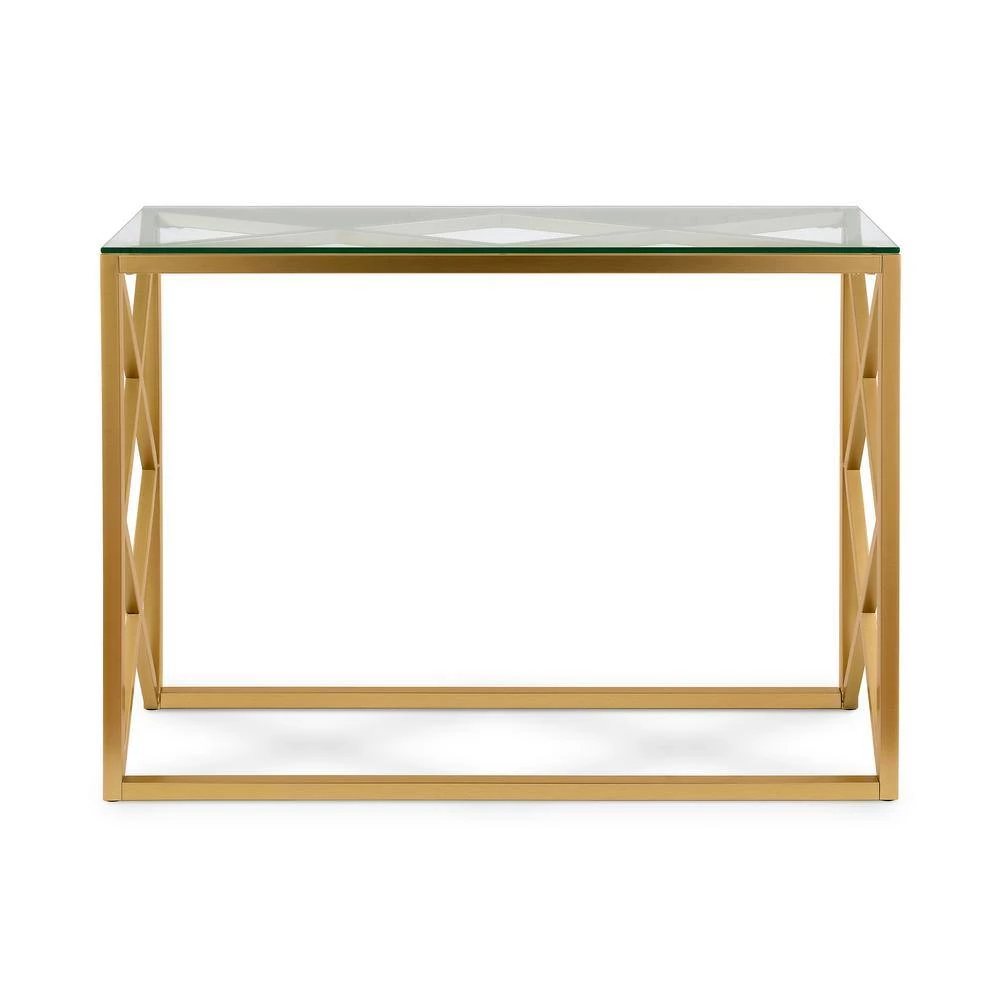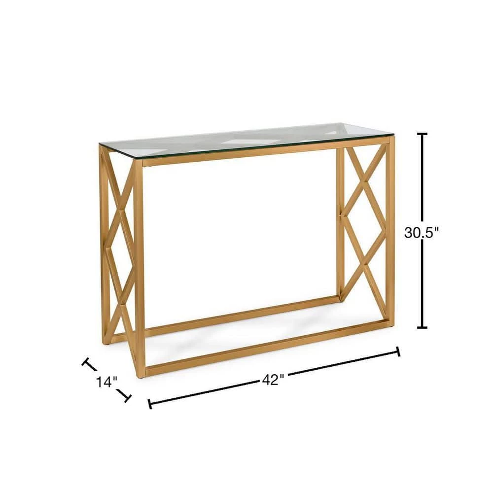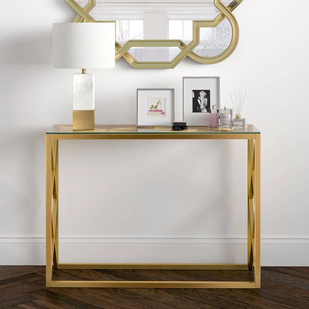 The luxe look of a geometric X bring this classic console table ahead of the trend curve. This glam piece will brighten up any room. With a tempered glass top that perfectly silhouettes the frame, it fits seamlessly into any space.