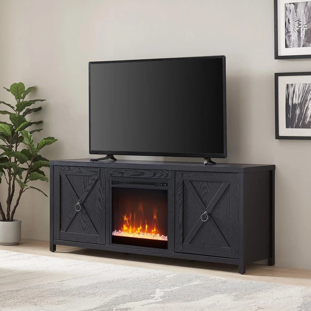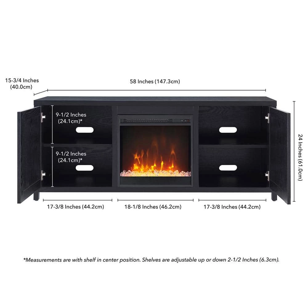 - Features an electric fireplace insert with crystal-look rocks and led faux-flames