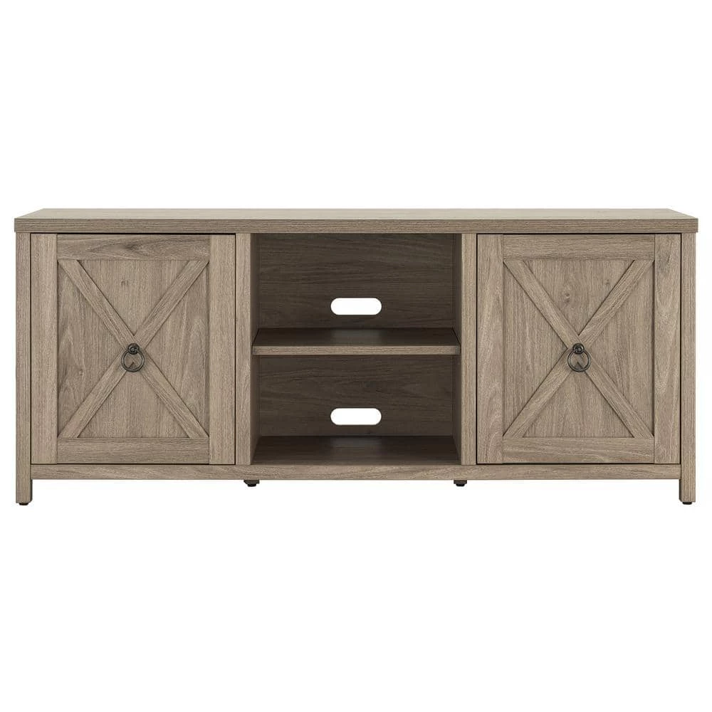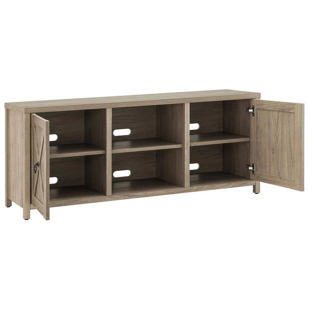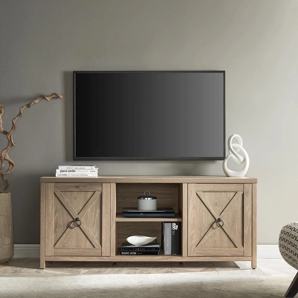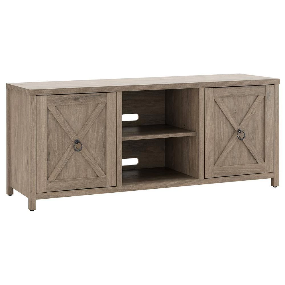 Combine functionality and classic modern farmhouse design with this sturdy TV stand. Its rich wood tone creates a warm neutral palette that will blend seamlessly into any color scheme, while its side cabinets allow for plenty of hidden storage. A must-have for living areas and entertainment spaces, this TV stand sets the stage for the big game, a movie marathon, or that season finale everyone’s been talking about.