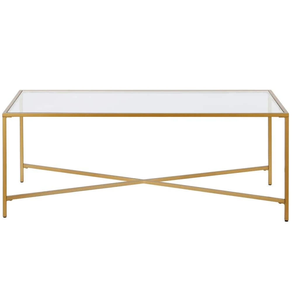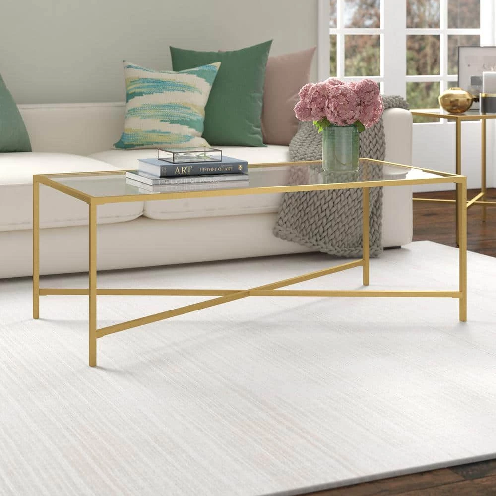 Geometric design takes this modern coffee table to the next level. A luxe blend of glass and steel gives this table a touch of glam style while the minimalist silhouette blends seamlessly with your existing decor scheme. Easy to assemble and easier to style, the durable tempered glass tabletop and on-trend frame shape make it the perfect addition to your living room or bedroom ensemble.