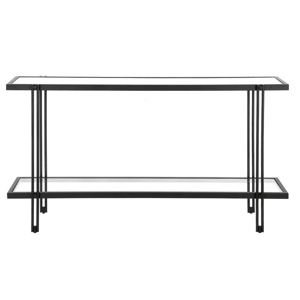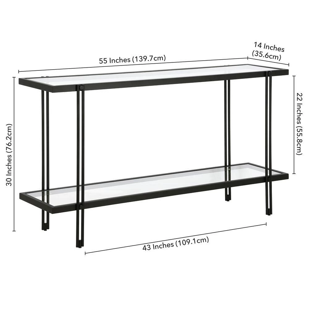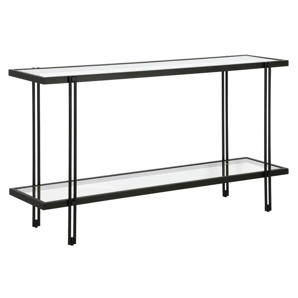 Complete your hallway or living room ensemble in modern style with this contemporary console table. Crafted of premium steel hand-crafted in a brass finish, this sofa or entryway table features a clean-lined rectangular silhouette on four straight legs. The open lower glass shelf is great for housing books, magazines, and extra belongings.