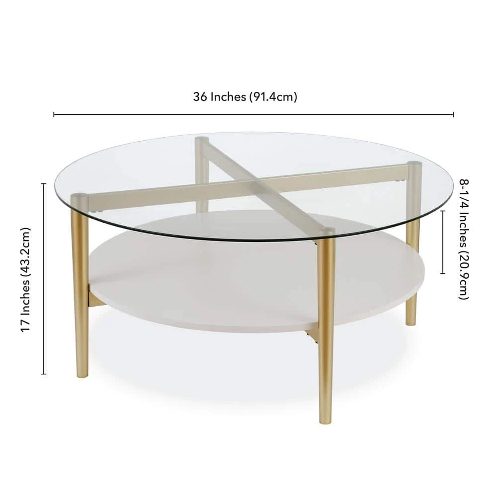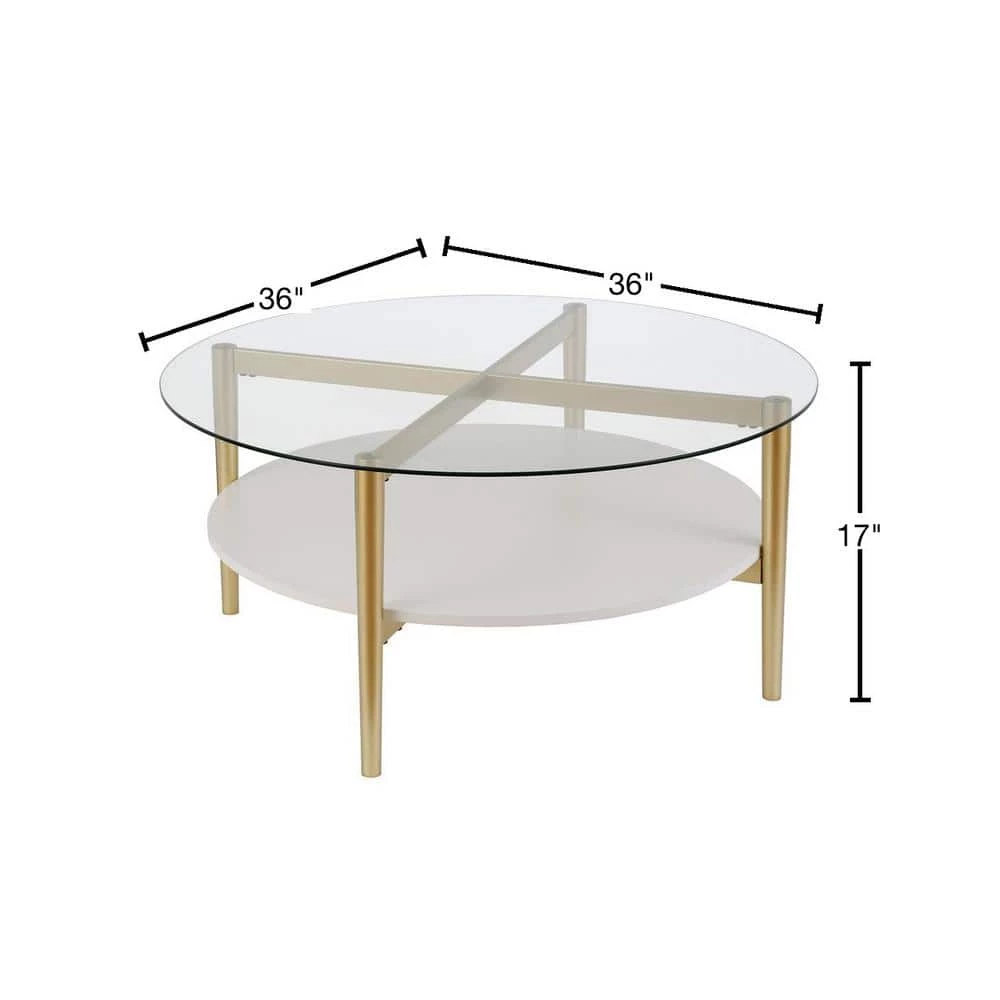 This mid-century inspired coffee table is the perfect pick for your living room or den ensemble. Its base features four tapered legs connected at the center. The top is a transparent tempered glass which shows off the architectural connection and carries the circular design through the frame. The lower shelf is made in a shiny white lacquer, playing off the tempered glass in shape and sheen. It’s finished in gold making it classic and neutral enough to work in any space.