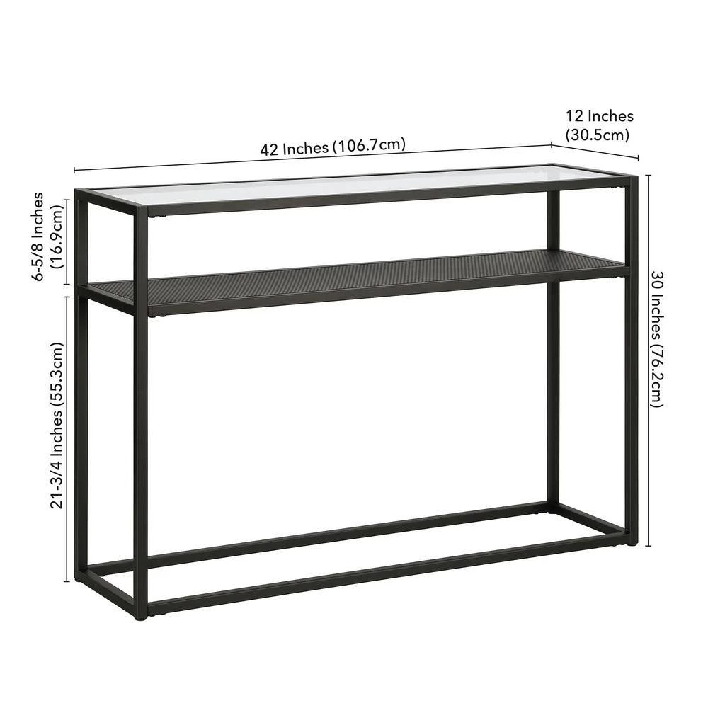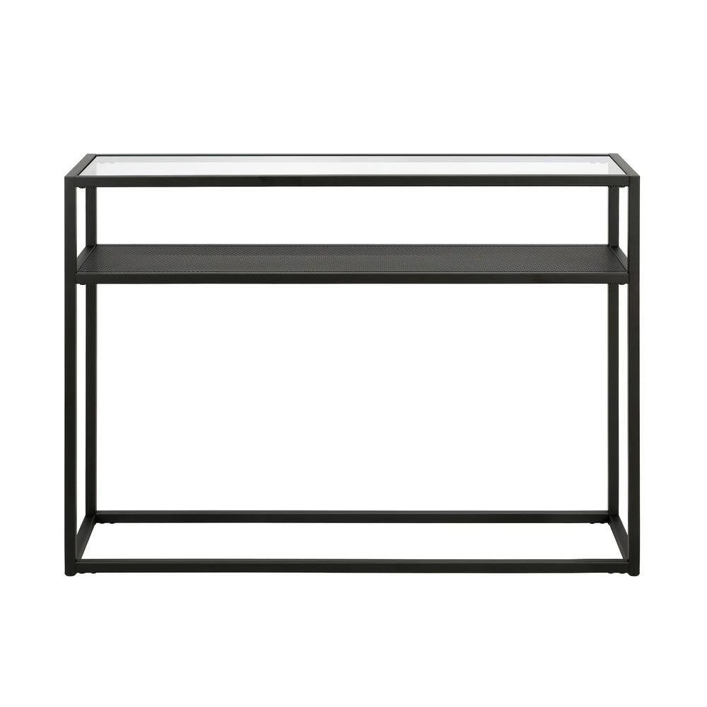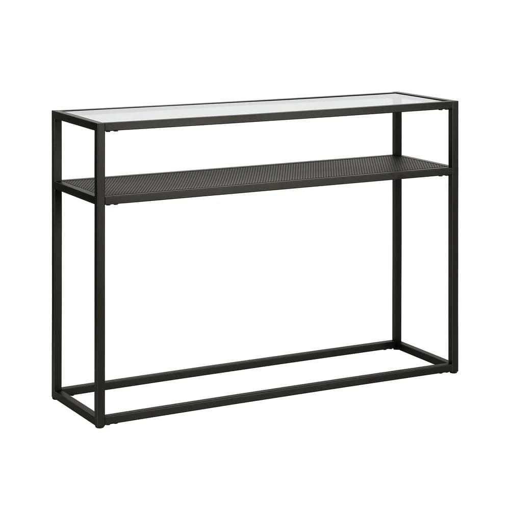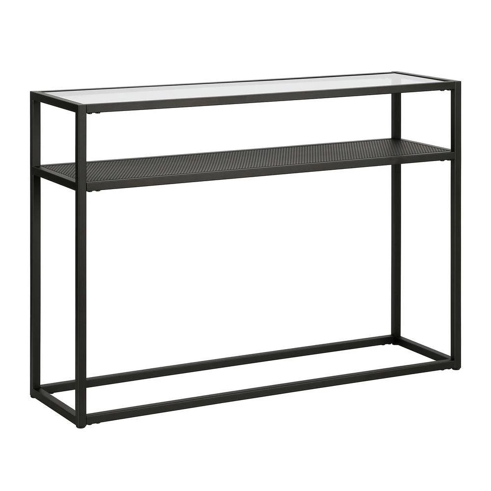 Bring streamlined design to your living room or entryway with this modern console table. Crafted of steel in a metallic finish, this console table features a 2-tiered rectangular silhouette with a perforated metal shelf perfect for storing mail, keys, knicknacks and more. The glass tabletop provides a perfect platform for framed photos or a pair of stylish lamps.