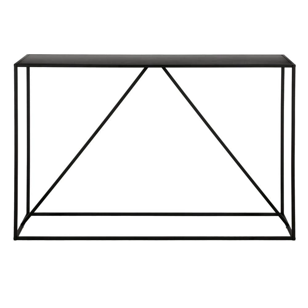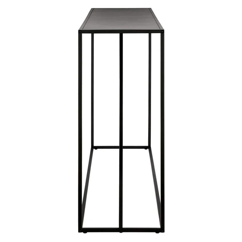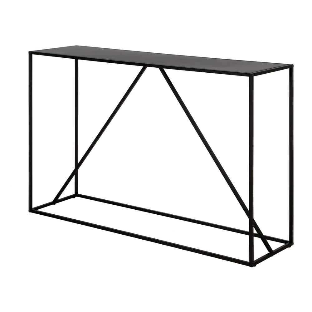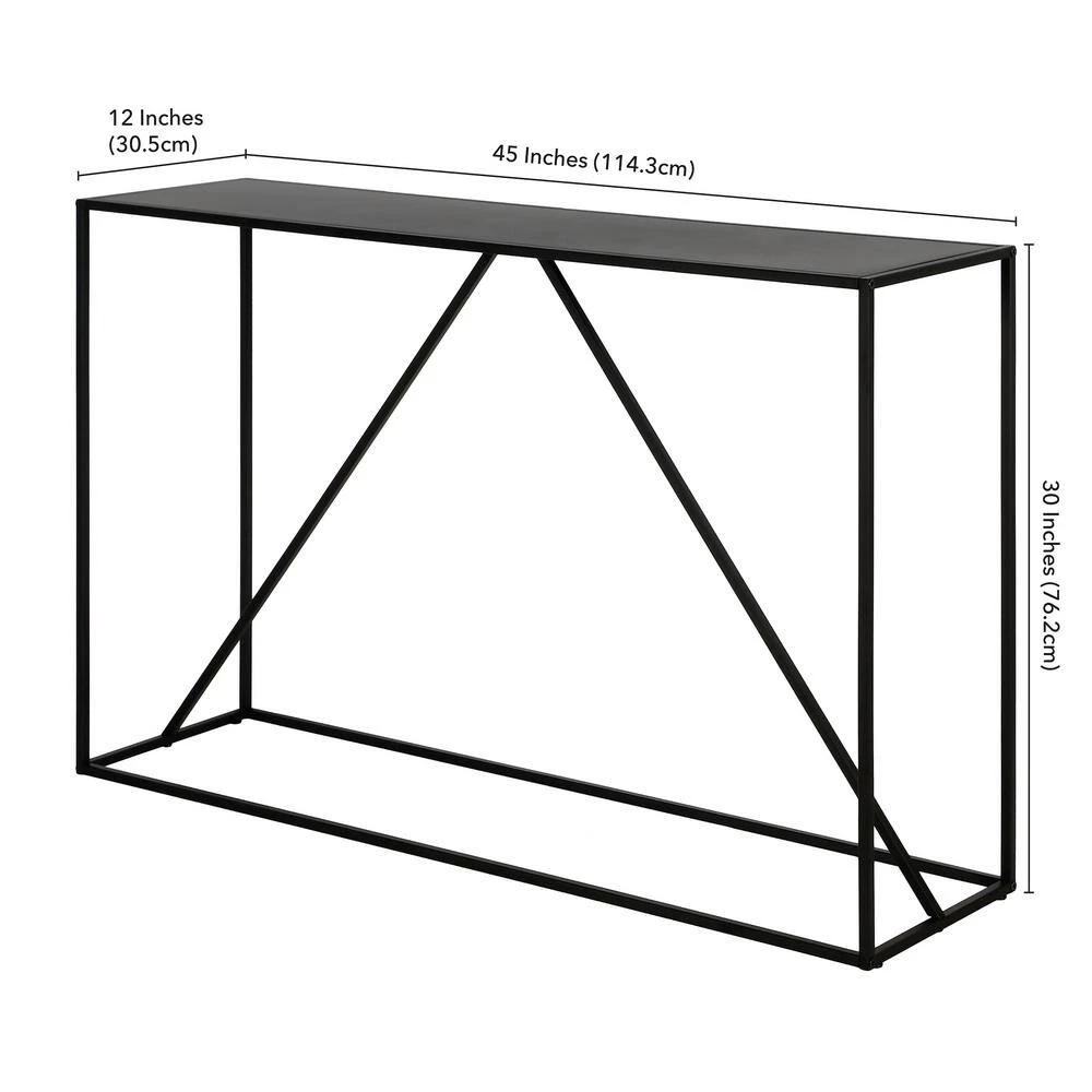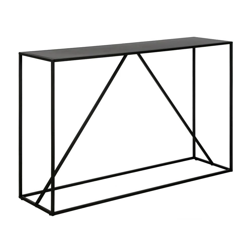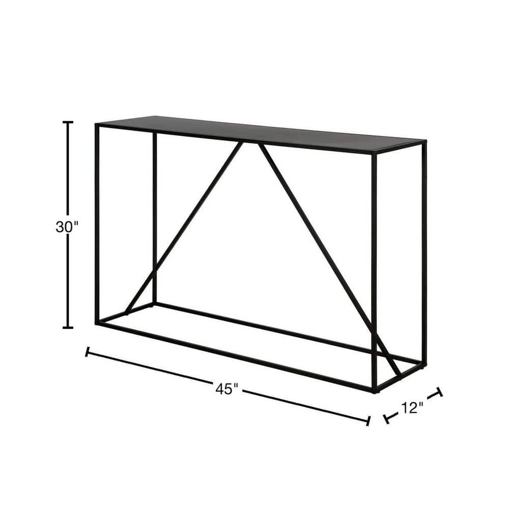 This console table is built for utility and design, featuring a metal top with a 40 lb weight capacity. Thoroughly modern in blackened bronze, it features a diagonal center support that adds stability and visual interest. Its narrow profile makes this a perfect choice for compact spaces where you need that extra bit of storage.