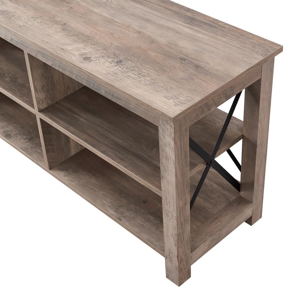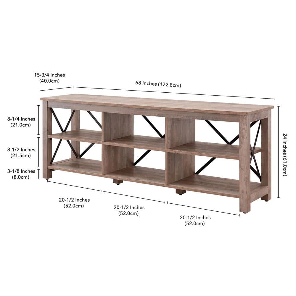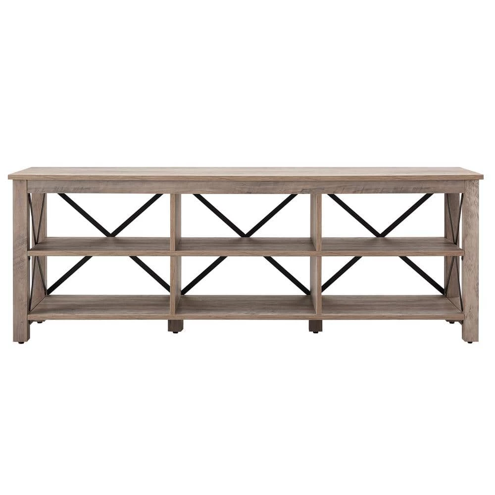 Strong geometric lines set this modern farmhouse-inspired TV stand apart. Its X-shaped black metal accents offset the rich wood tone, creating a warm neutral color palette that will blend seamlessly into any design scheme. A must-have for living areas and entertainment spaces, this TV stand sets the stage for the big game, a movie marathon, or that season finale everyone’s been talking about.