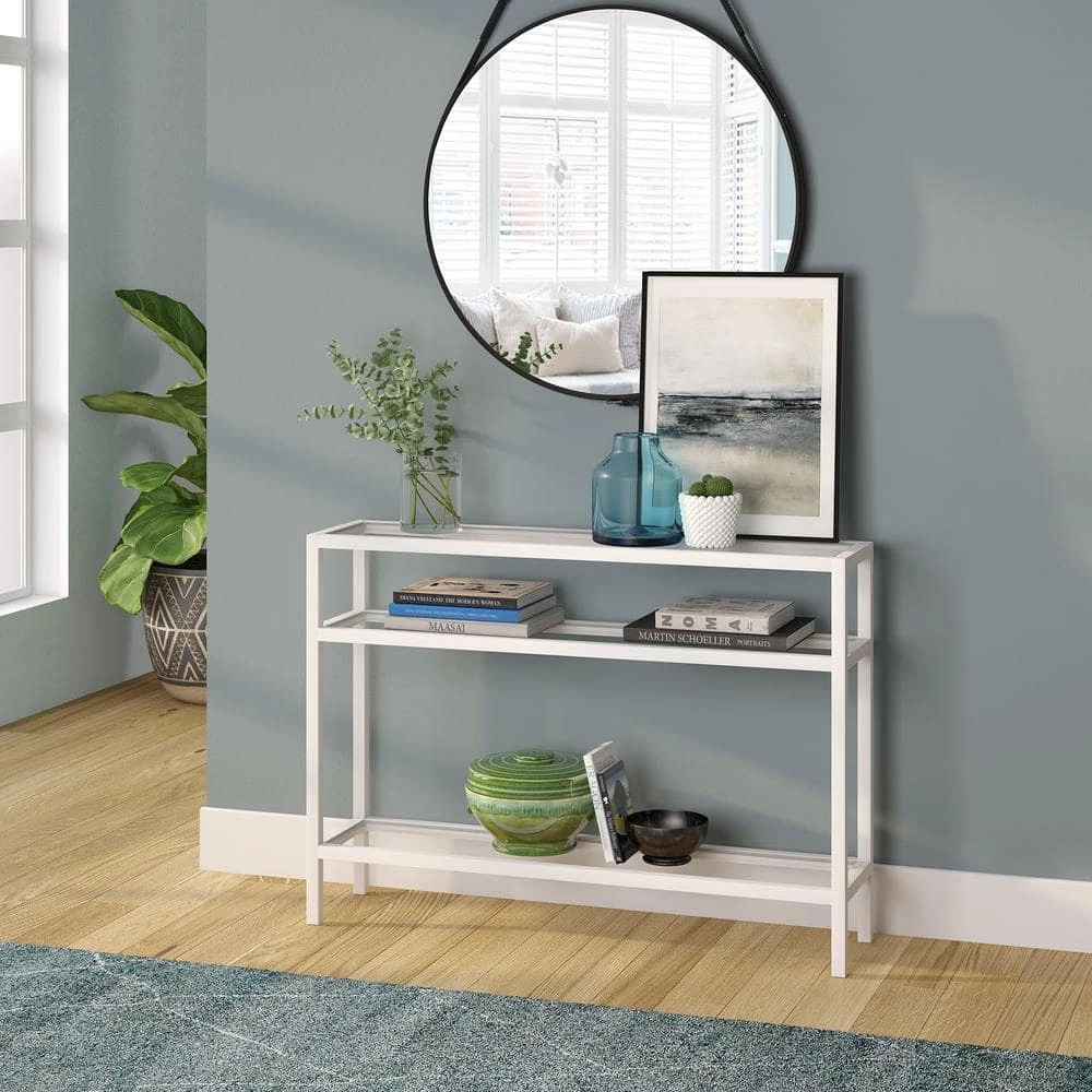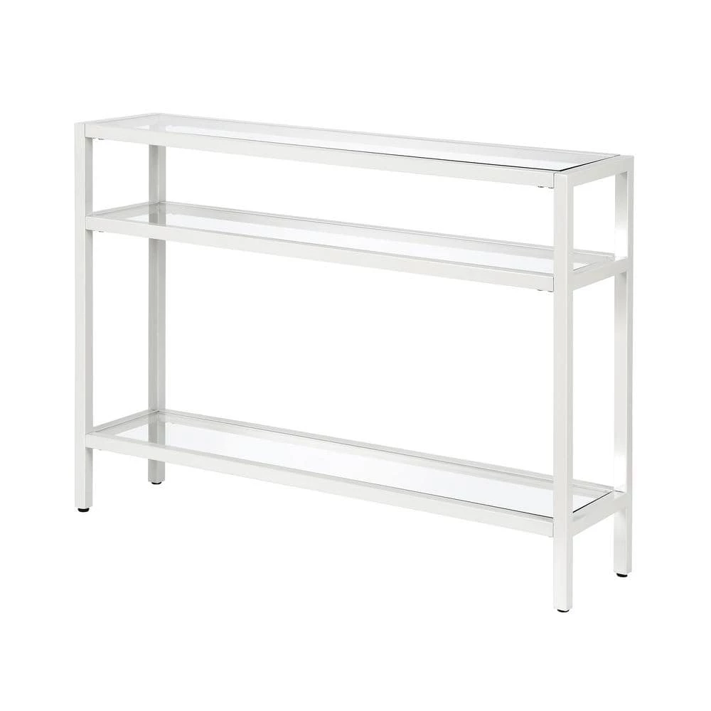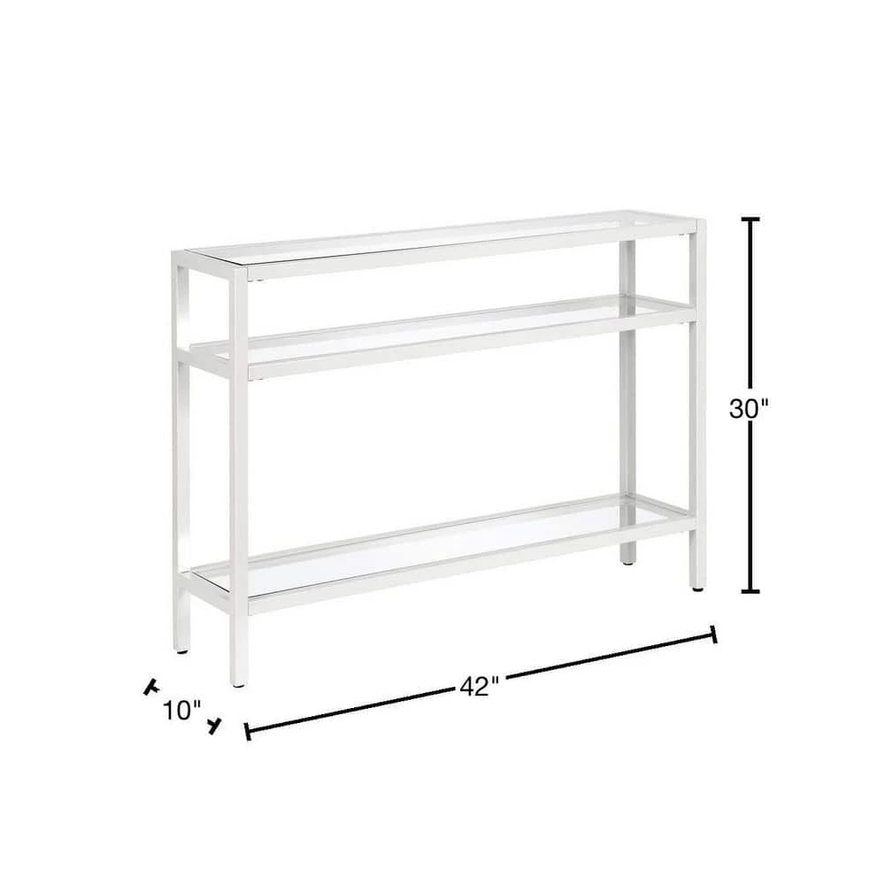 This modern industrial coffee table combines design with function. The glass top shows the unique structure of the white legs. Whether tucked behind the sofa or a display for a menagerie of trinkets, this console table is the perfect backdrop to create a magazine-ready display.