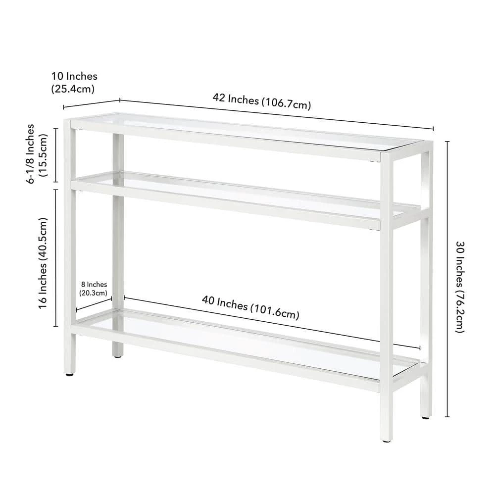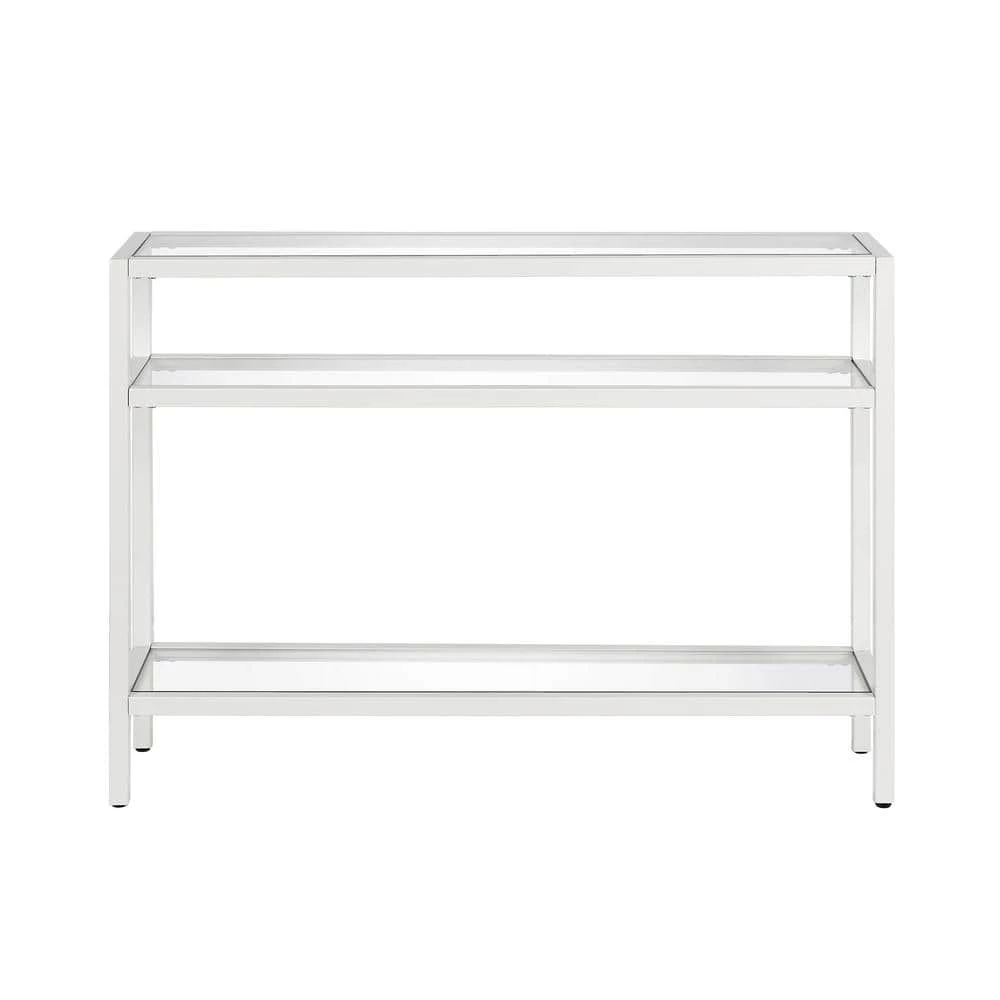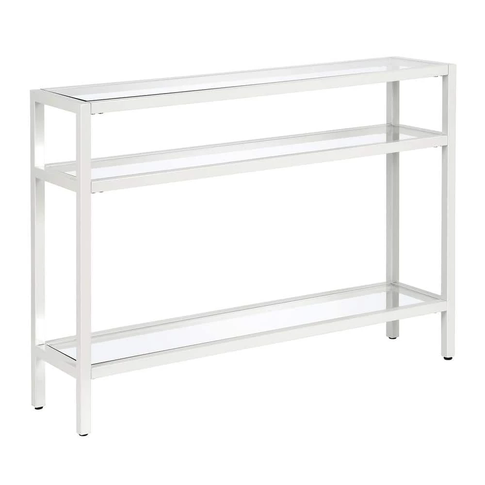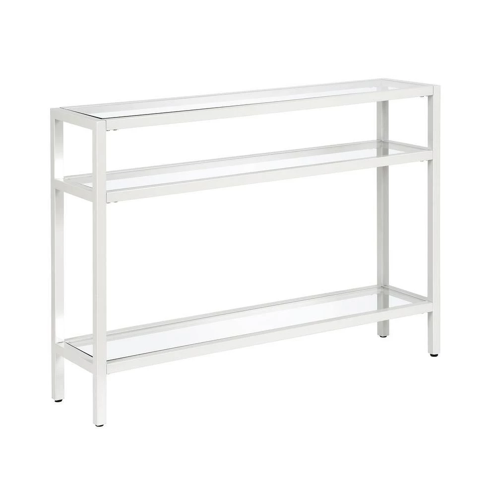 This modern industrial coffee table combines design with function. The glass top shows the unique structure of the white legs. Whether tucked behind the sofa or a display for a menagerie of trinkets, this console table is the perfect backdrop to create a magazine-ready display.