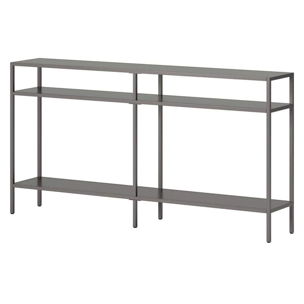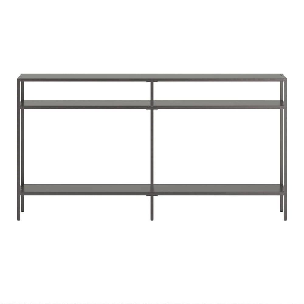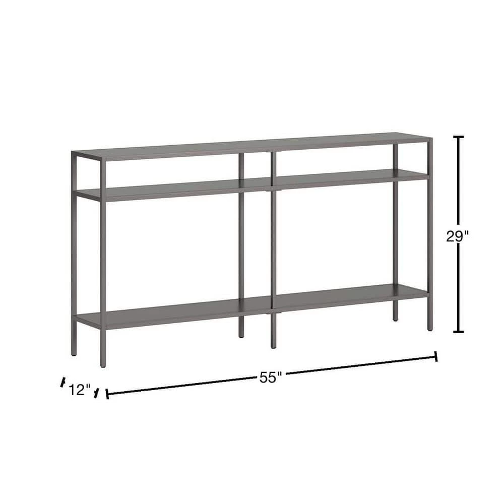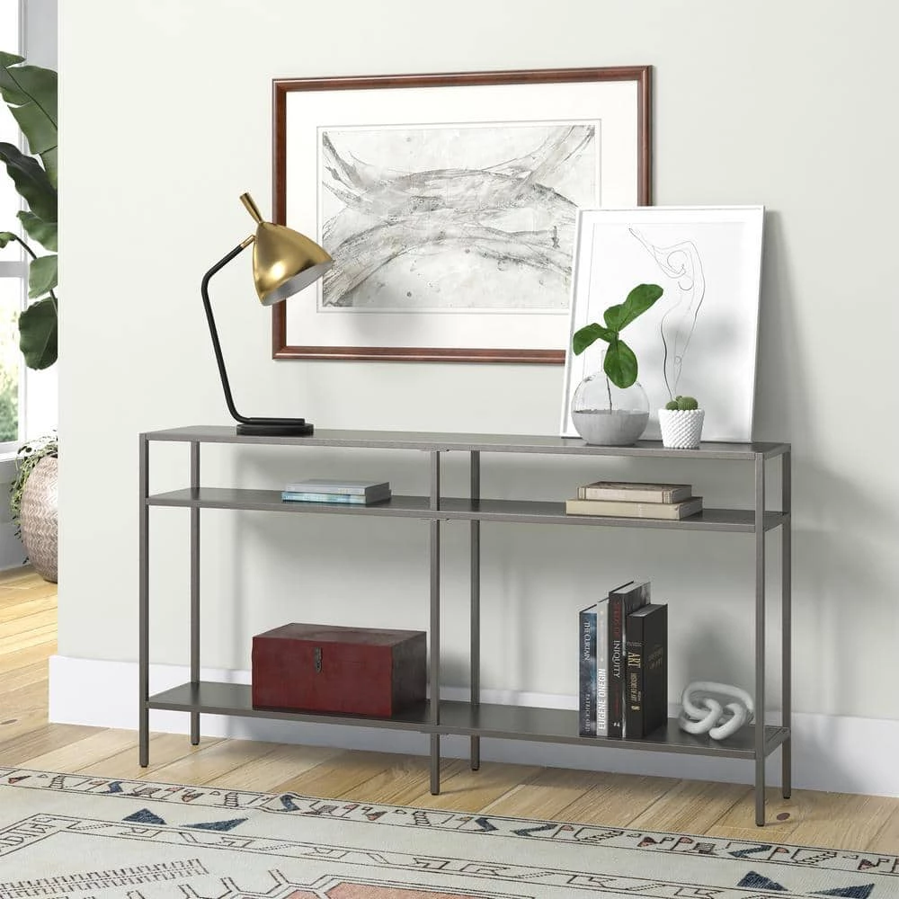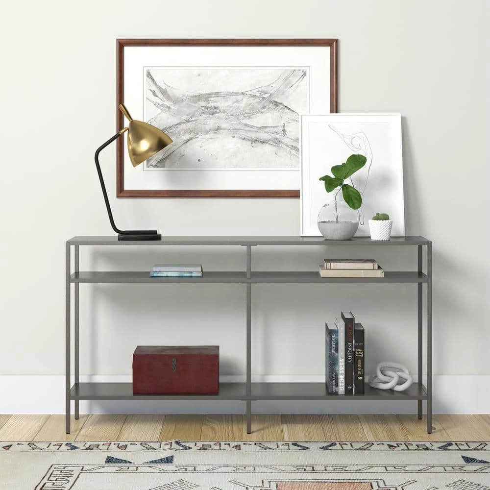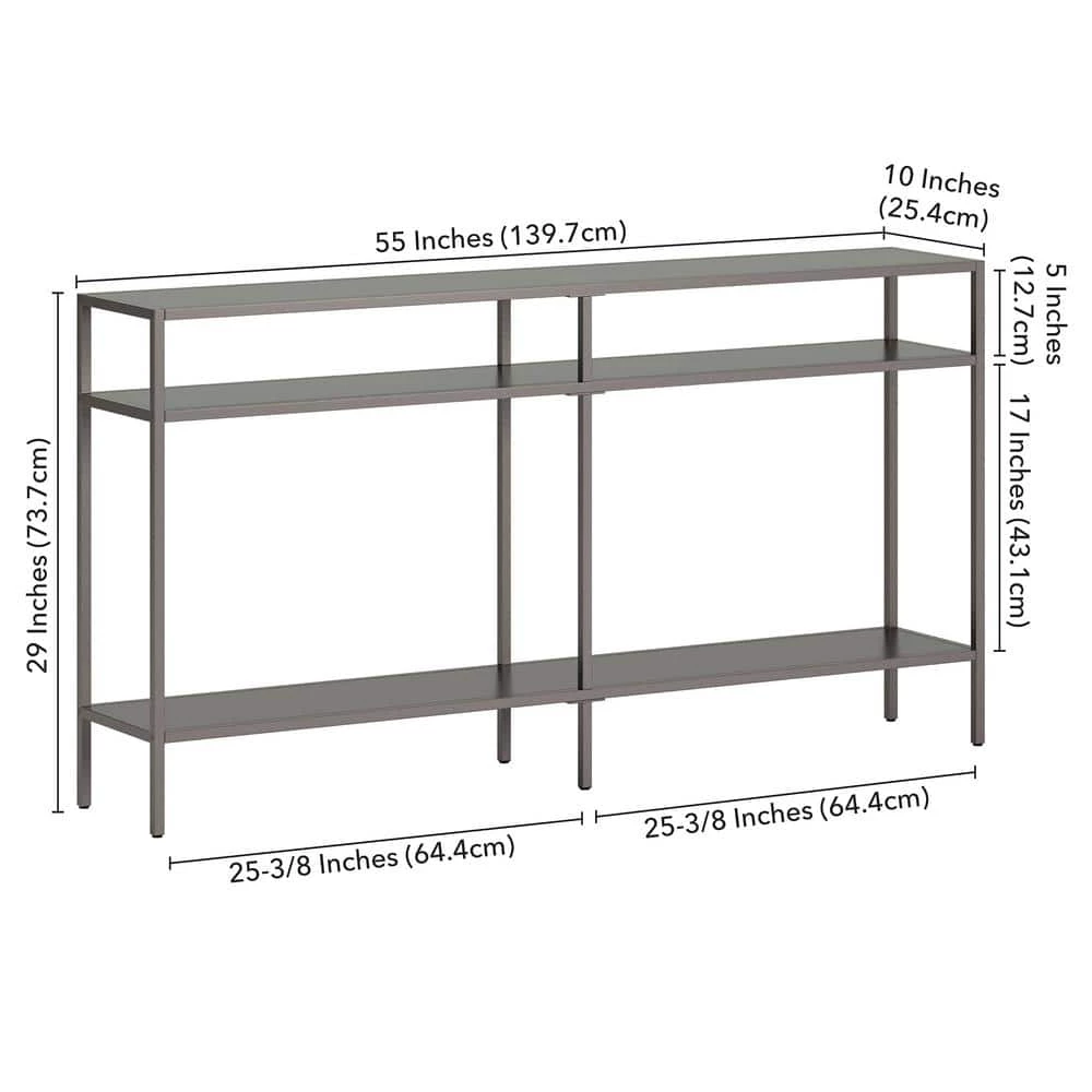 This modern industrial coffee table combines design with function. Create a warm welcome with the clean lines of this 55″ console table. Whether tucked behind the sofa or a display for a menagerie of trinkets, this console table is the perfect backdrop to create a magazine-ready display.