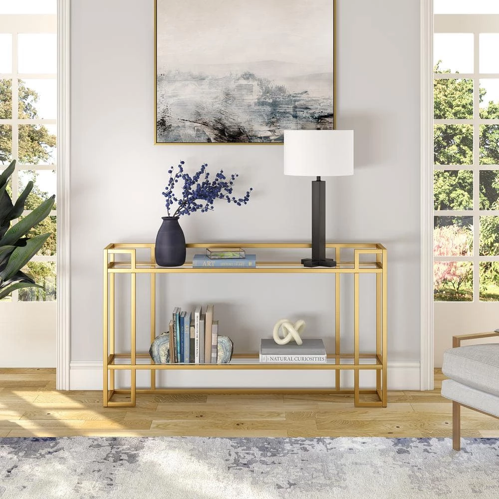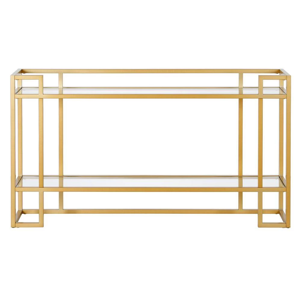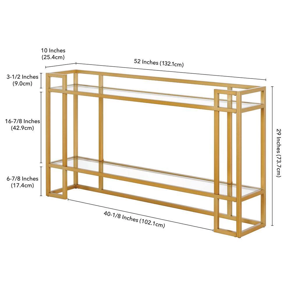 A strong linear profile sets this Art Deco-inspired console table apart. Its overlapping geometric lines offset the durable tempered glass tabletop and shelf, creating an artful backdrop for framed photos, flowers, or your favorite collections of decorative items. The streamlined look and neutral metallic finish pairs seamlessly with your existing color scheme and decor style.