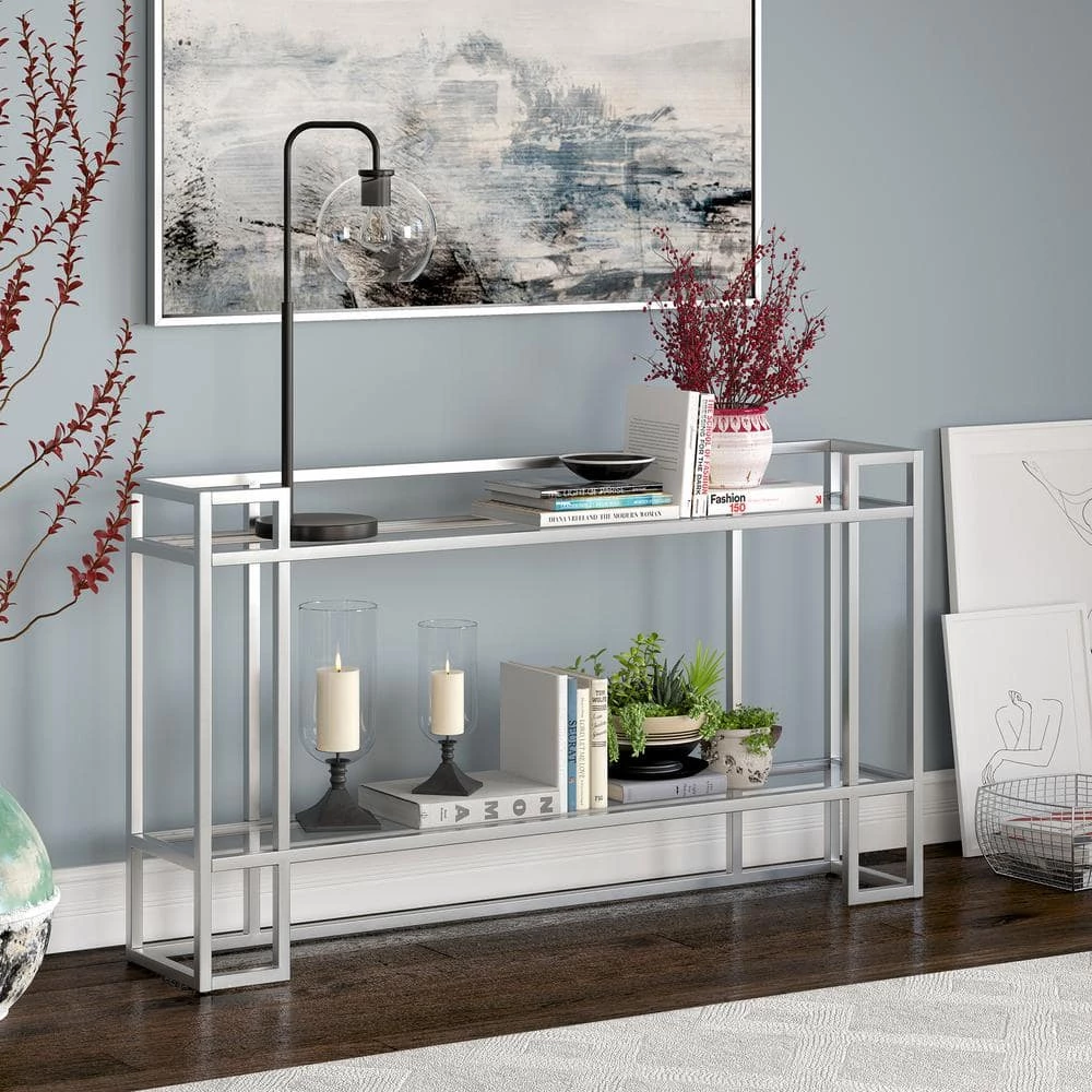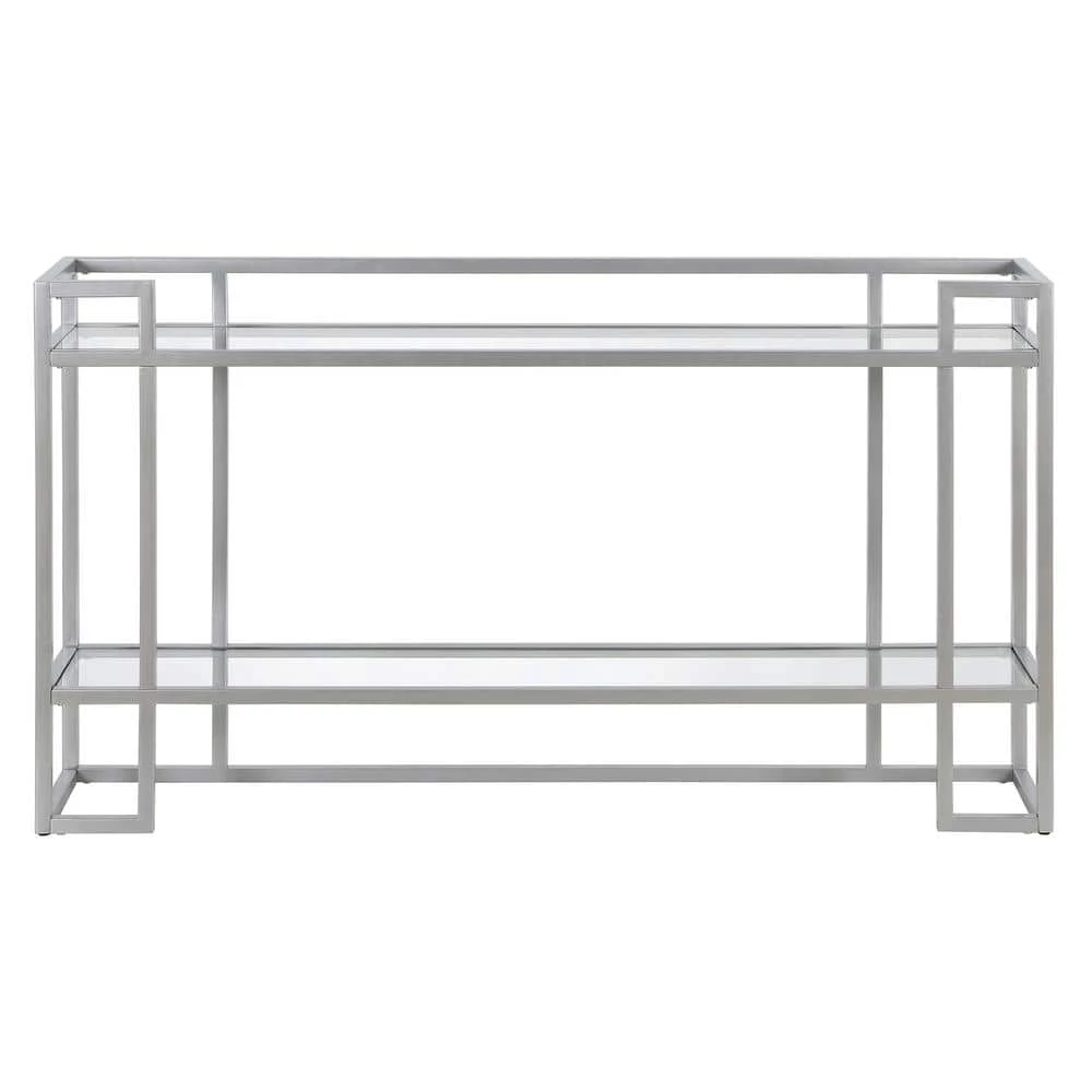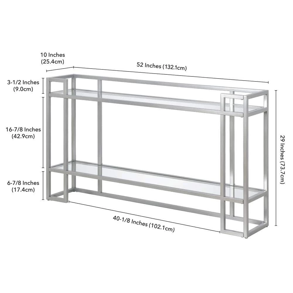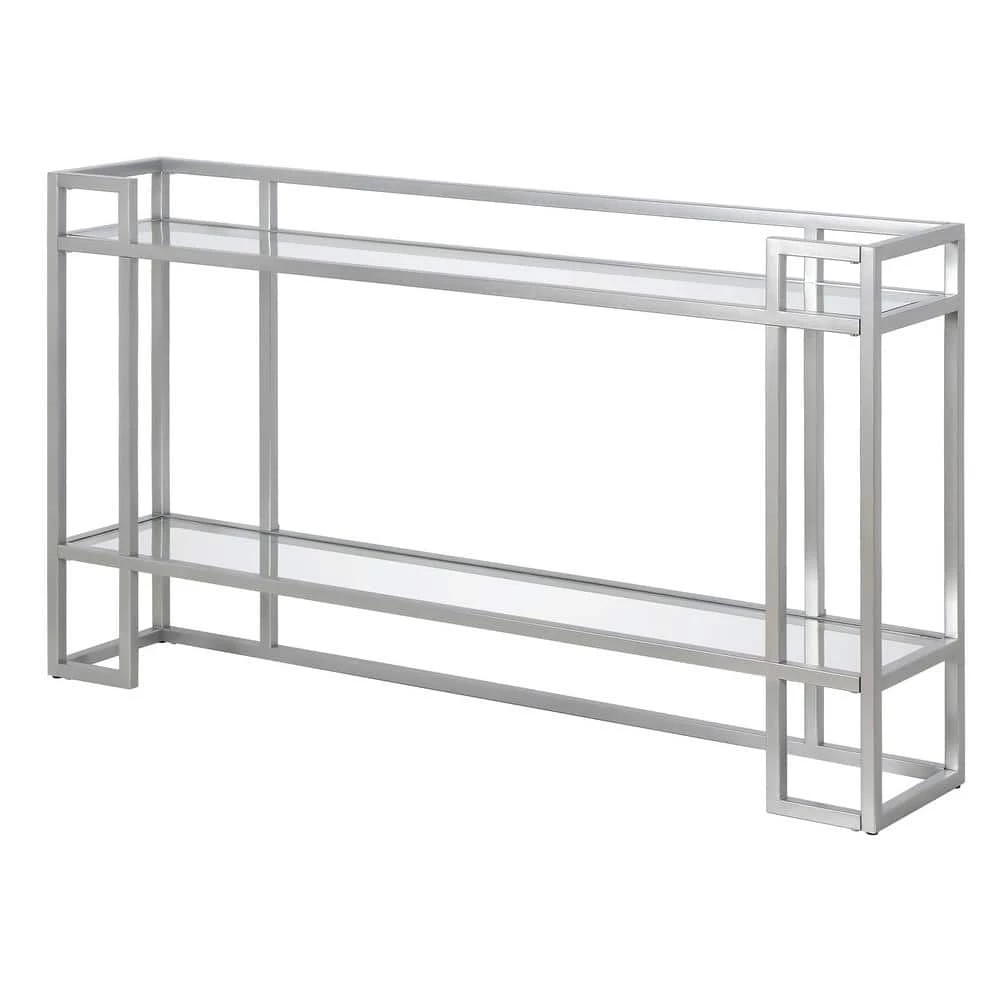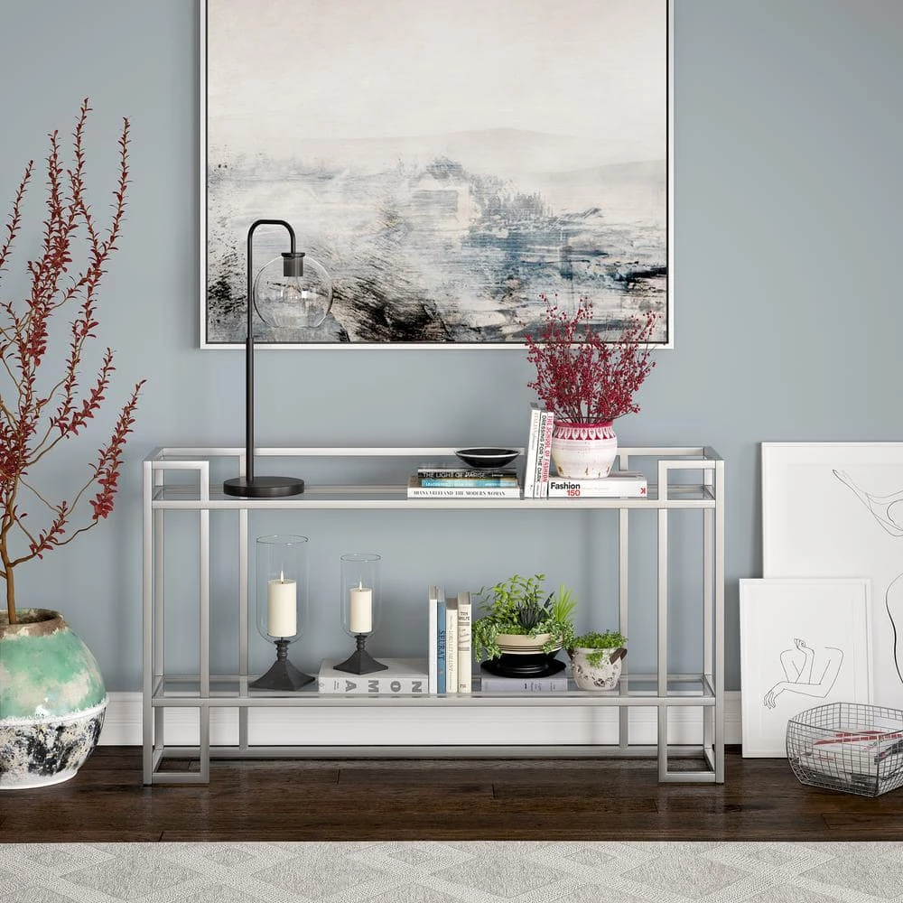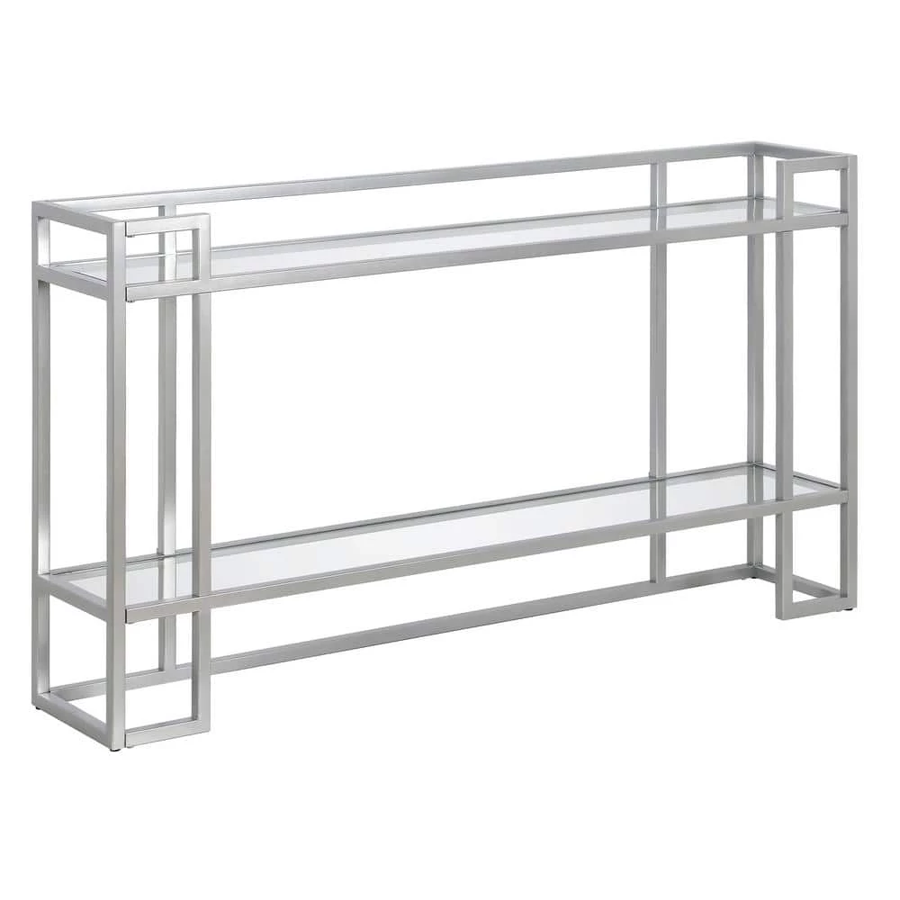 A strong linear profile sets this Art Deco-inspired console table apart. Its overlapping geometric lines offset the durable tempered glass tabletop and shelf, creating an artful backdrop for framed photos, flowers, or your favorite collections of decorative items. The streamlined look and neutral metallic finish pairs seamlessly with your existing color scheme and decor style.