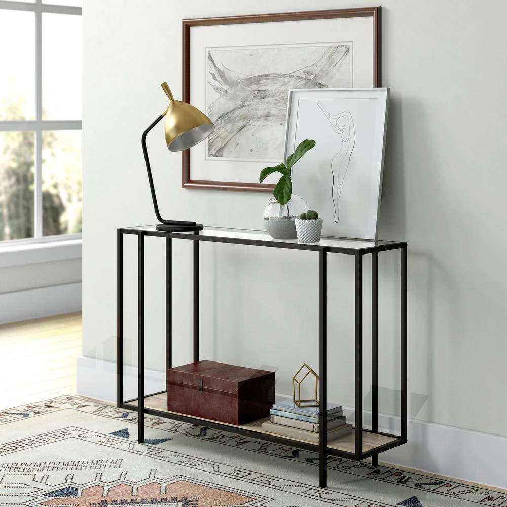 Clean, mid-century-inspired lines adorn this table, from its blackened bronze frame and accents, to its thoughtfully paired oak-colored shelf. It combines natural elements with modern elegance to offer fashionably functional storage. This table’s clean lines and mixed materials pair perfectly across even the most eclectic design schemes.