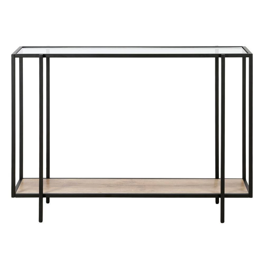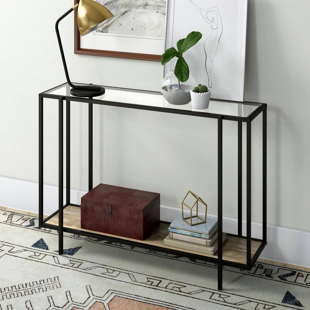 - Tabletop is made of tempered glass, lower shelf is finished in a complementary wood tone.