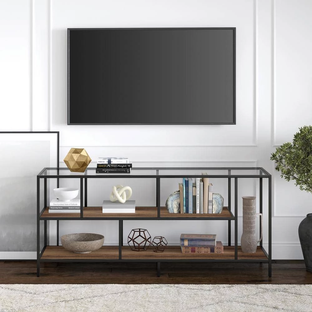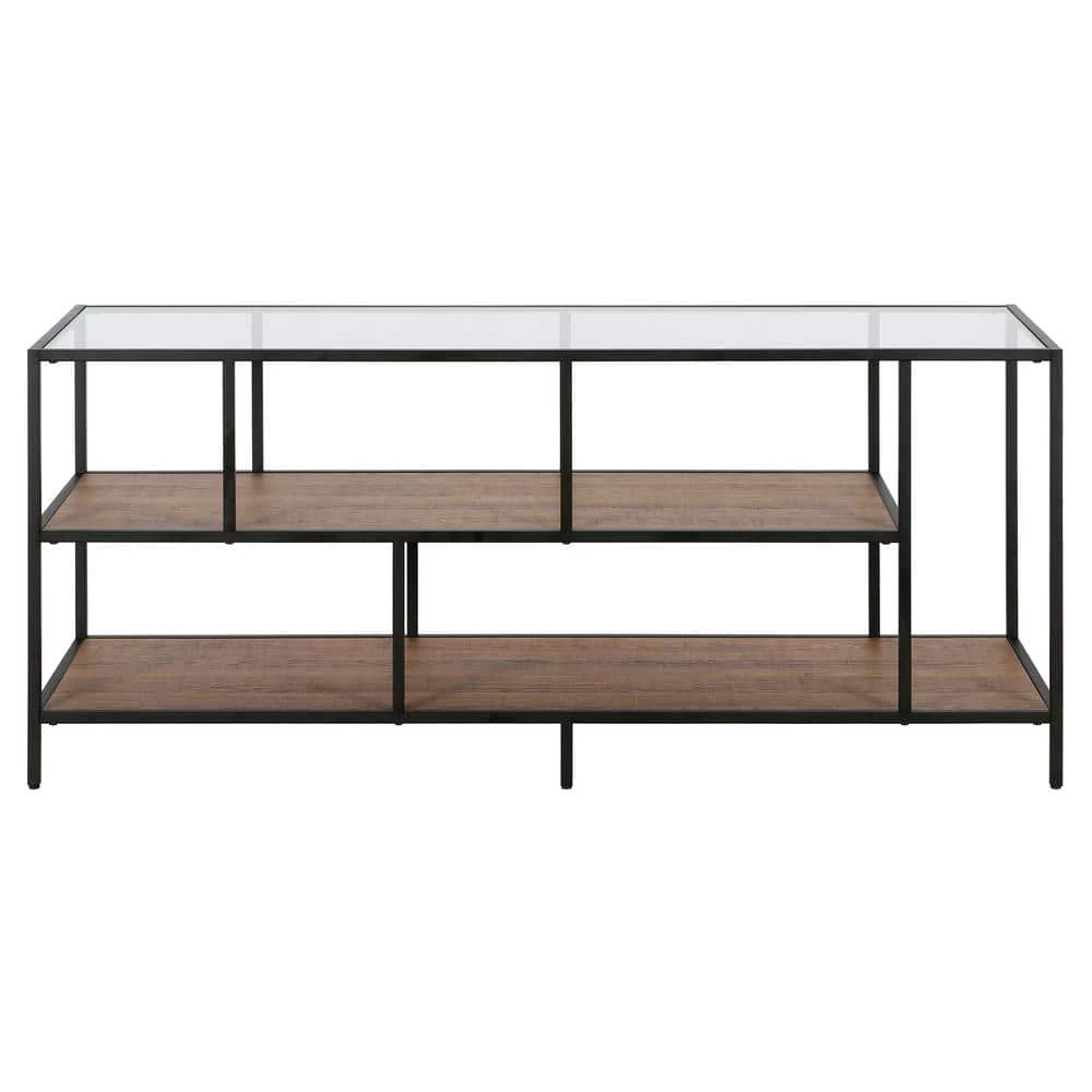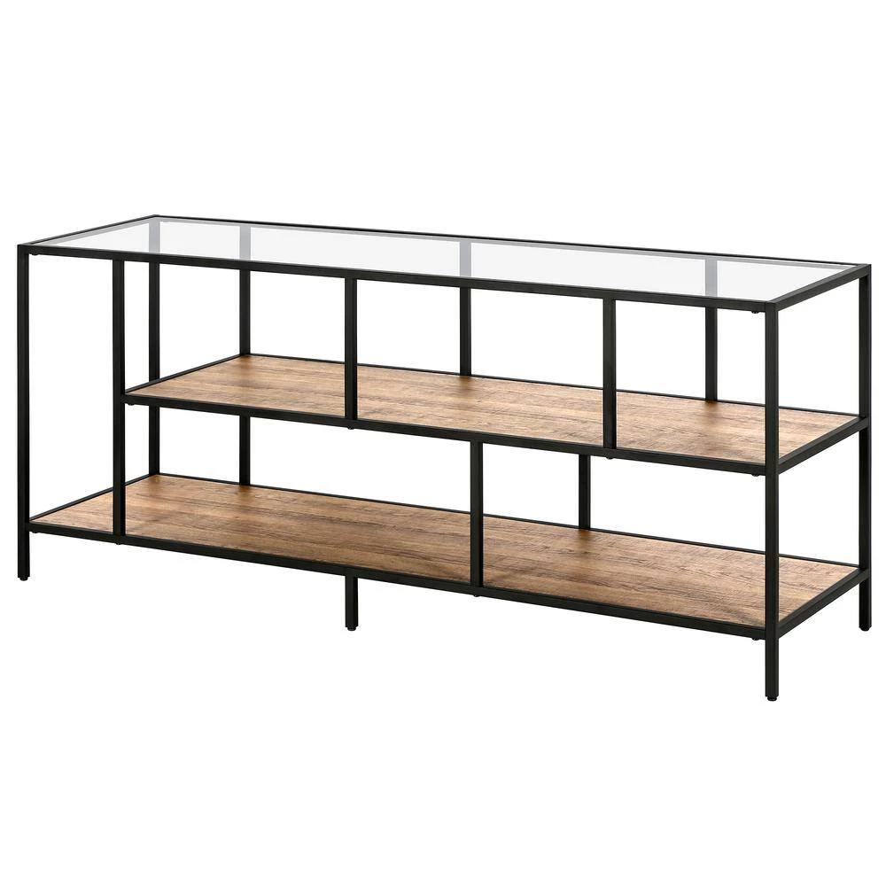 A must-have for living areas and entertainment spaces, this TV stand sets the stage for the big game, a movie marathon, or that season finale everyone’s been talking about. Crafted from steel, it features a durable tempered glass top and shelves finished in rustic oak for a look that blends with nearly any color palette. The clean lines within the product compliment many design styles.