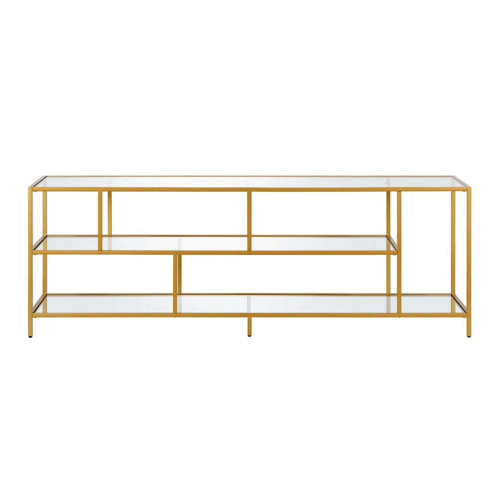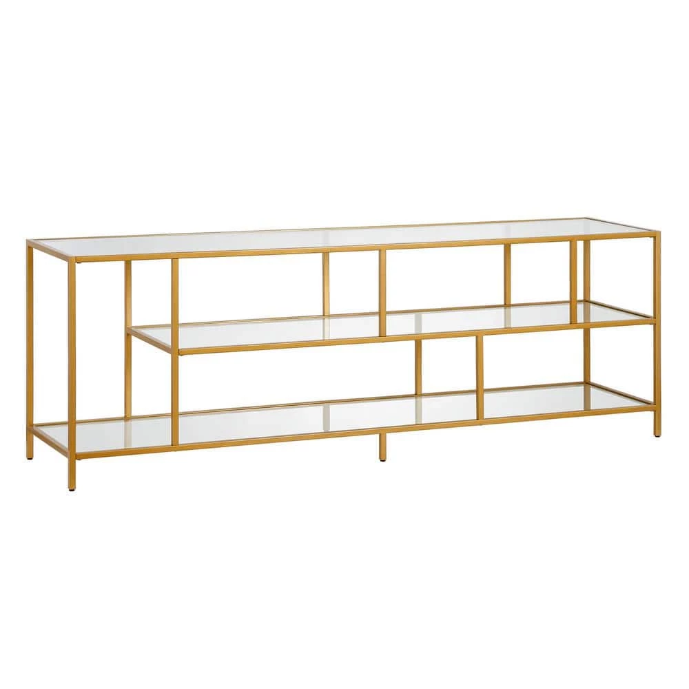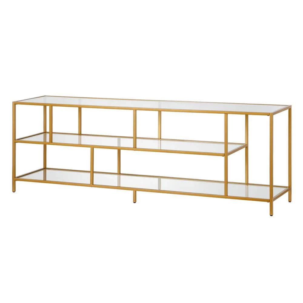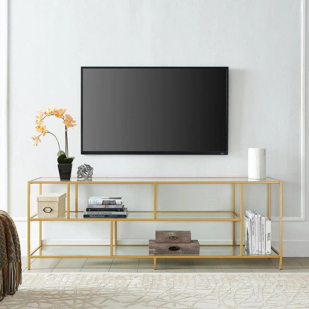 A must-have for living areas and entertainment spaces, this TV stand sets the stage for the big game, a movie marathon, or that season finale everyone’s been talking about. Crafted from steel, it strikes a clean-lined silhouette and boasts a metallic finish. The glass shelves add a look that blends with nearly any color palette.