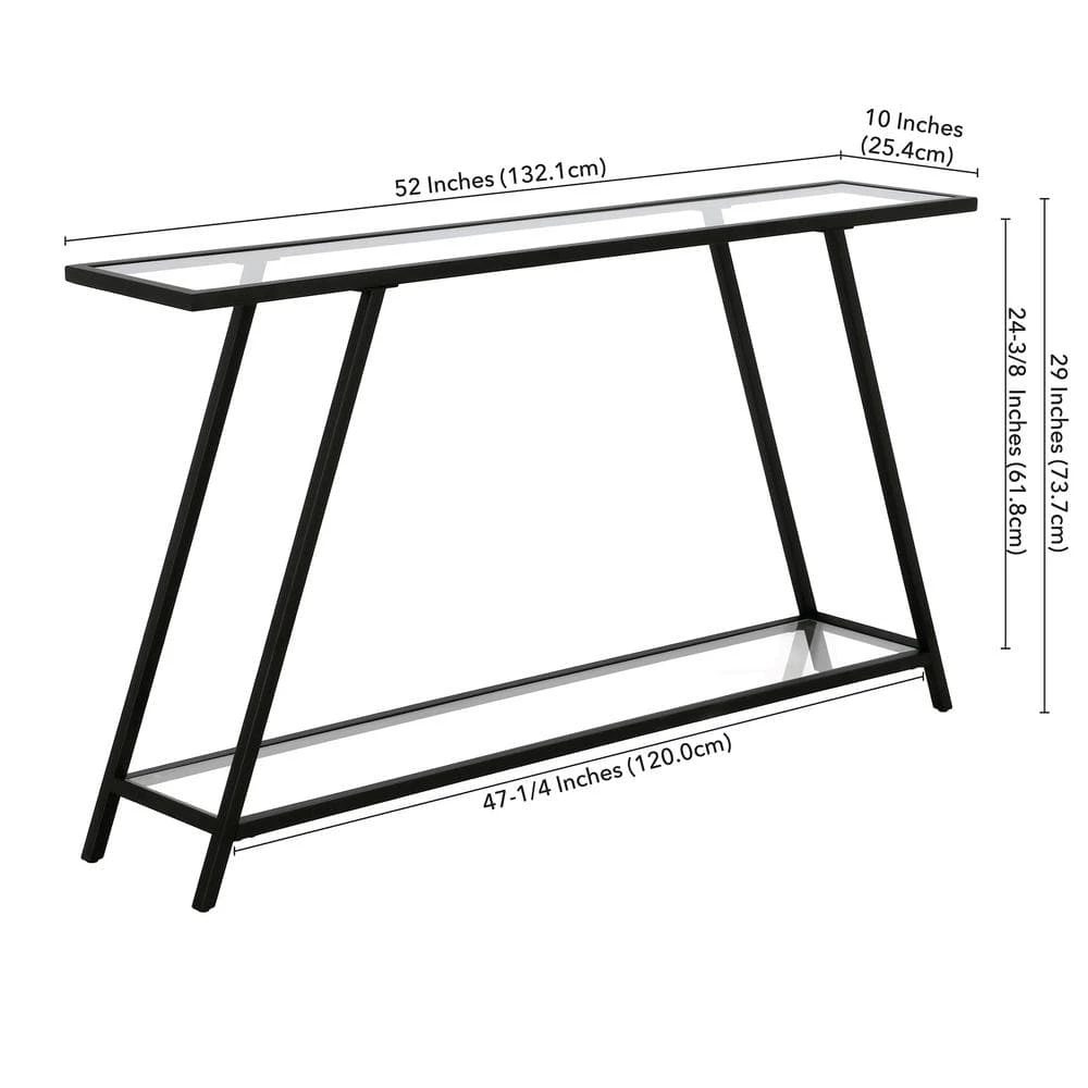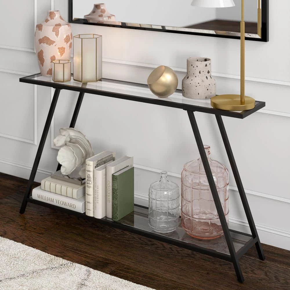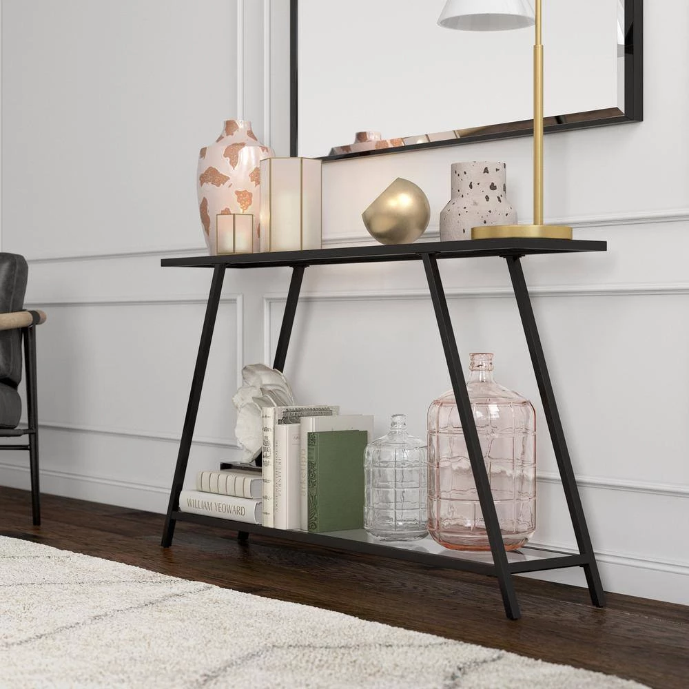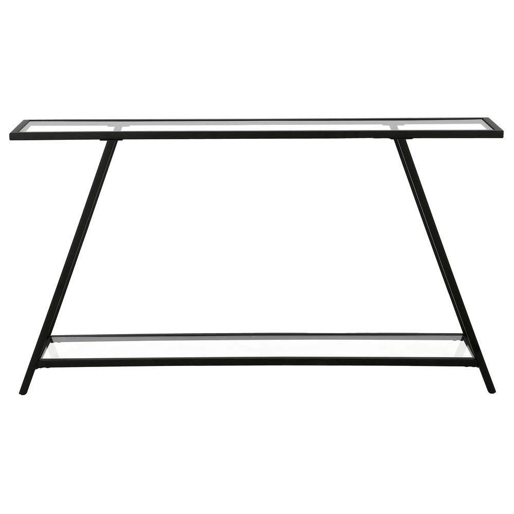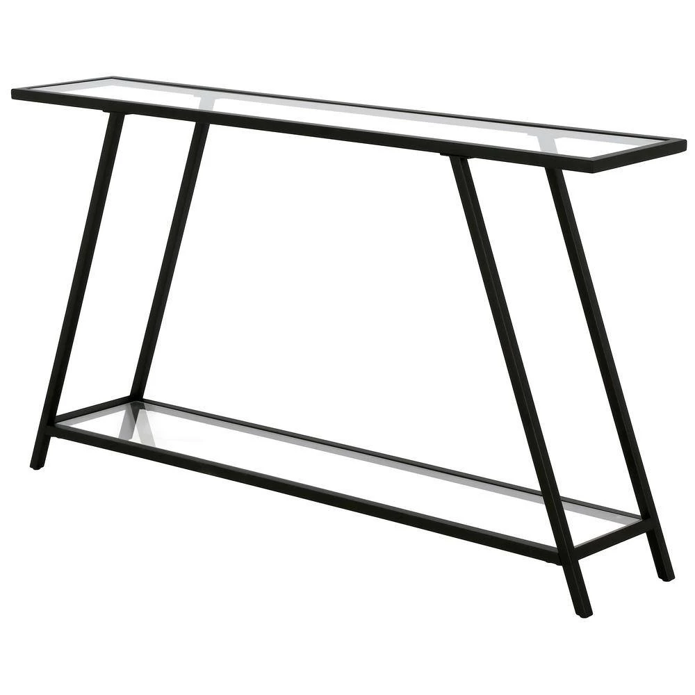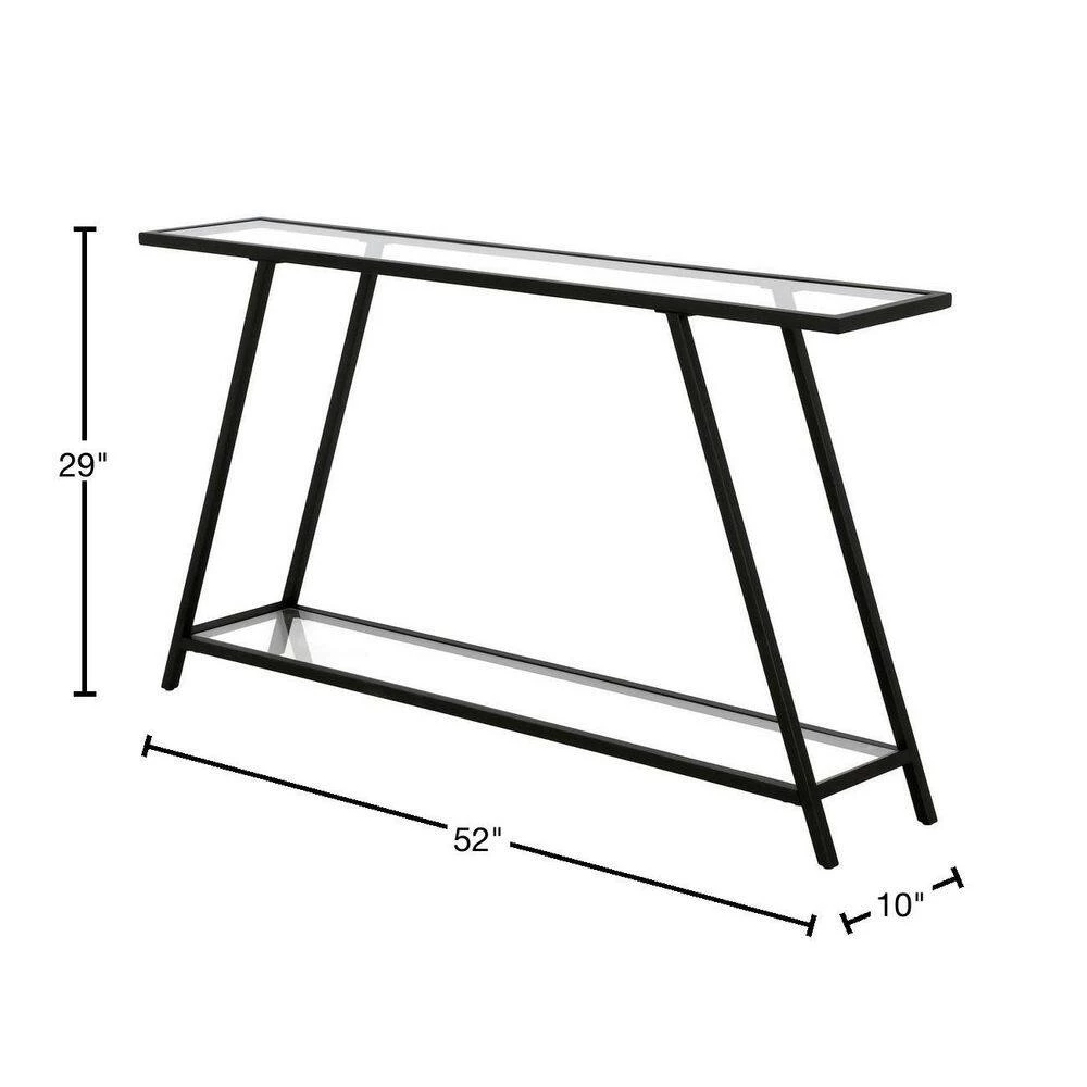 A unique angled profile sets this industrial-inspired console table apart. Its diagonal frame leans in to support and frame the durable tempered glass top and shelf, creating an artful backdrop for framed photos, flowers, or your favorite collections of decorative items. The streamlined look and neutral metallic finish pairs seamlessly with your existing color scheme and decor style.
